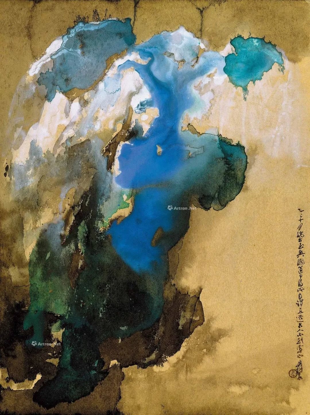 写在日本金卡纸上的张大千泼彩《瑞士雪山》以1376万港元成交。该作纯抽象处理,以中国式山水的气韵,表现外国雪山的景色,为大千泼墨泼彩最顶峰的呈现。
