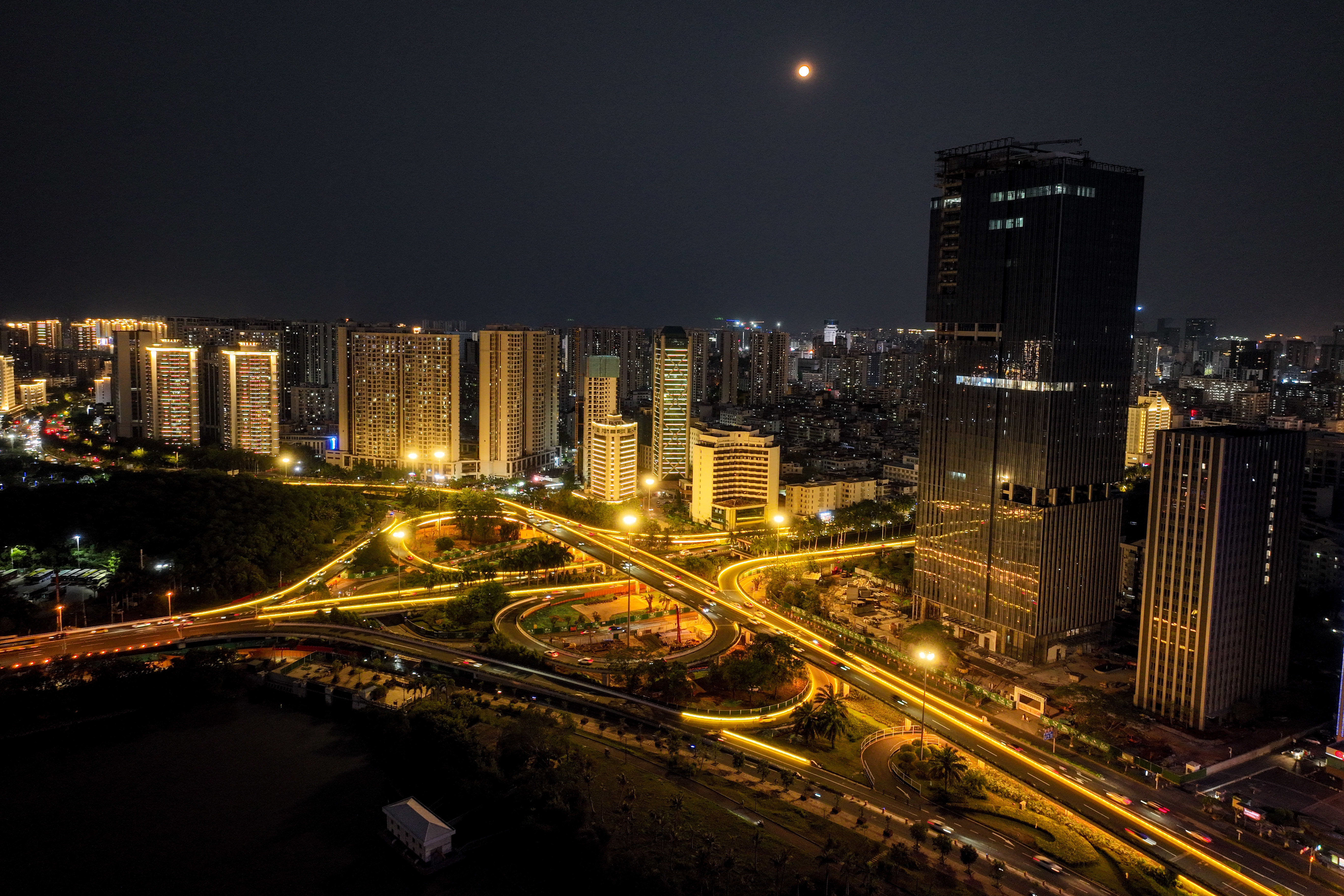 4月5日拍摄的海口滨海大道夜景(无人机照片)。新华社记者 张丽芸 摄
