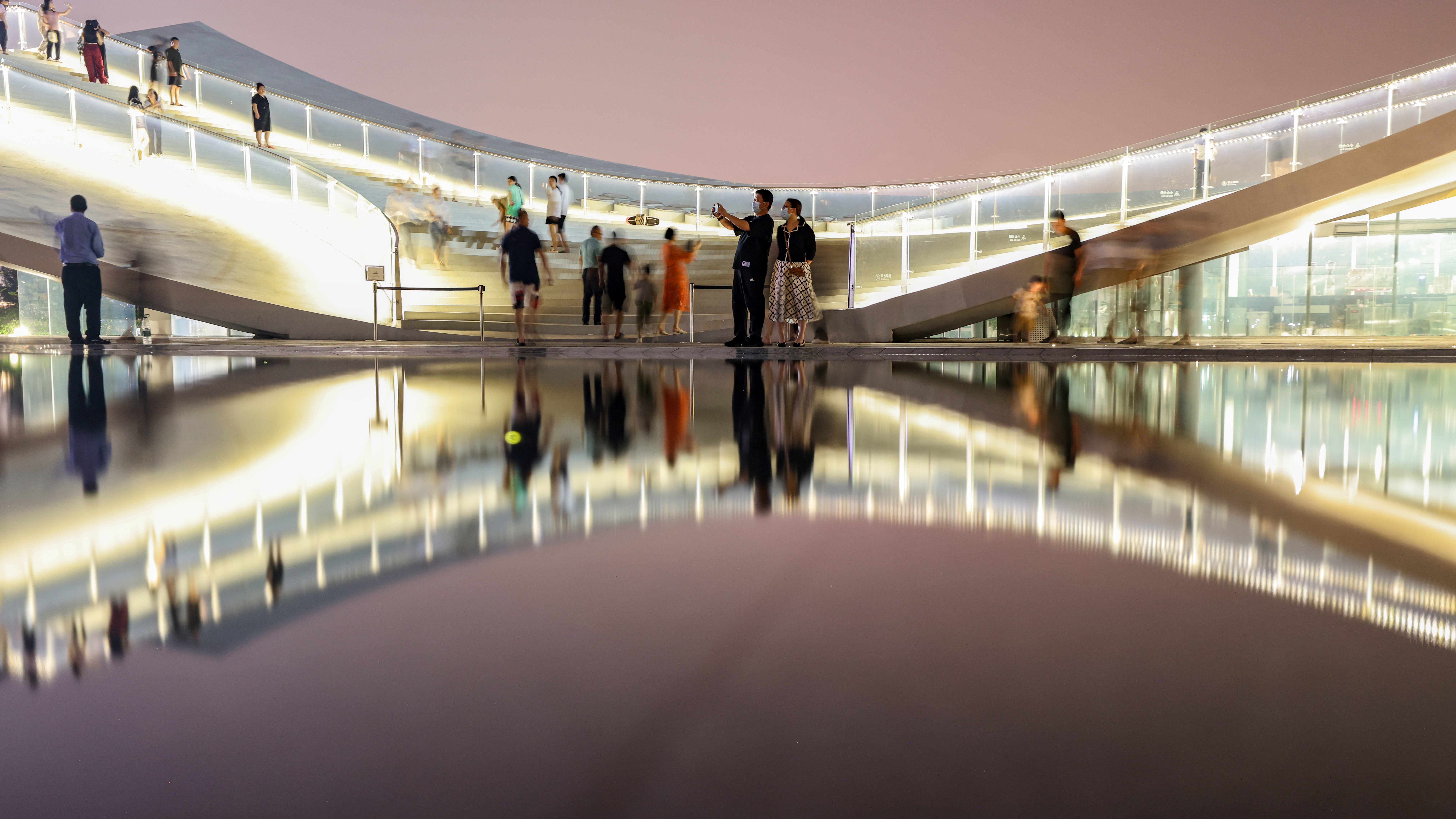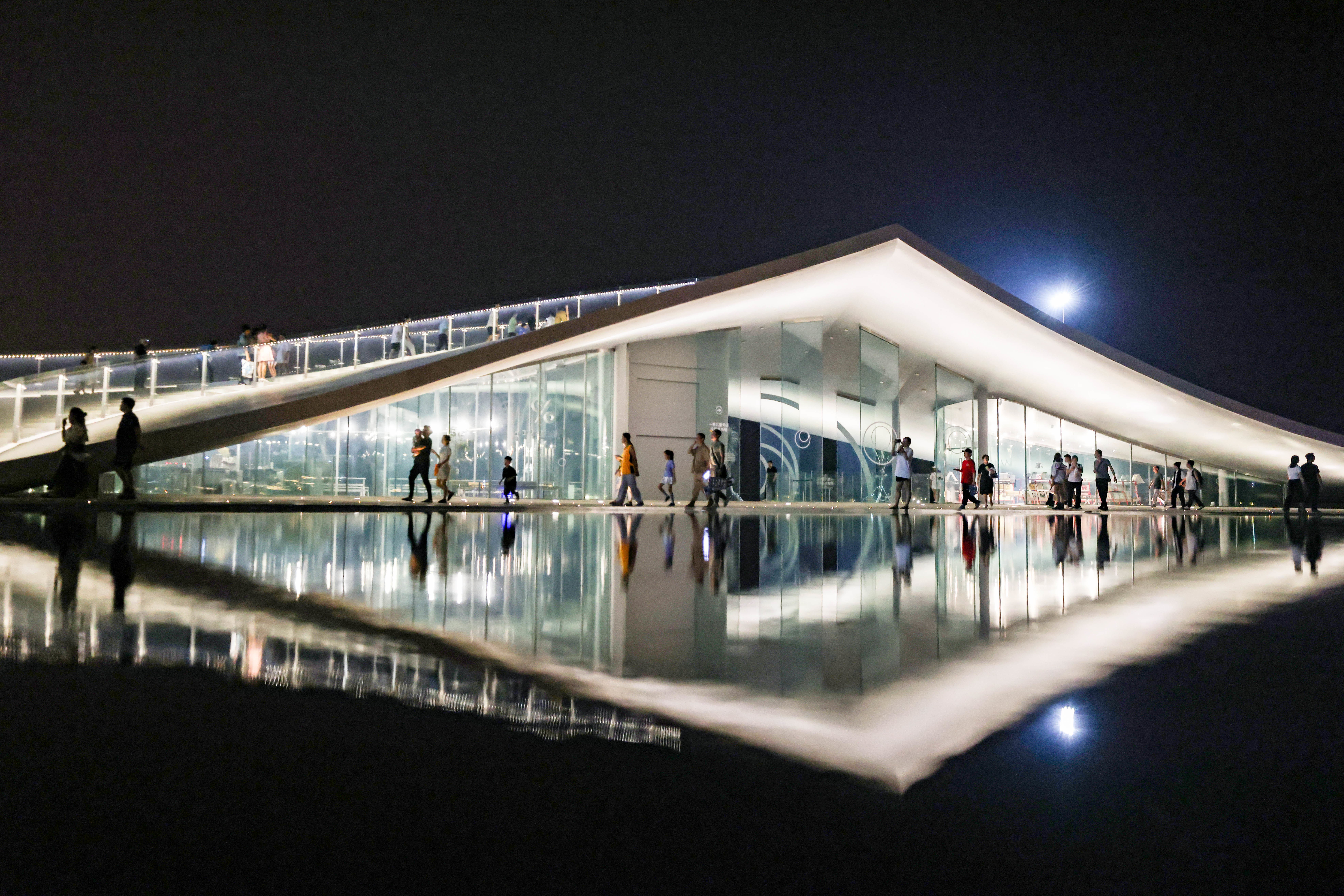 4月6日,游人在海口湾“天空之山”驿站观赏夜景。新华社记者 张丽芸 摄