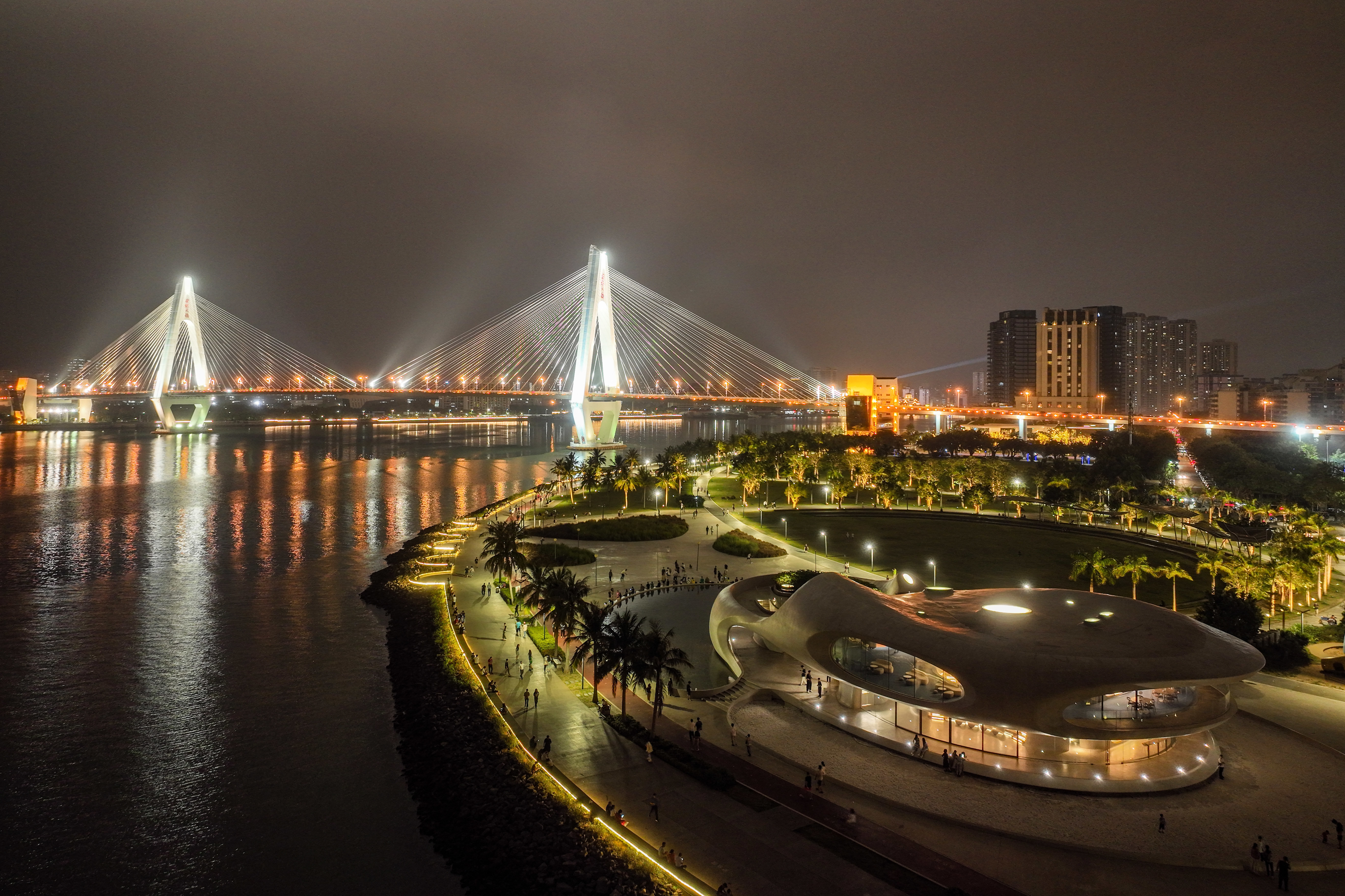 4月6日拍摄的海口湾云洞图书馆和世纪大桥(无人机照片)。新华社记者 张丽芸 摄
