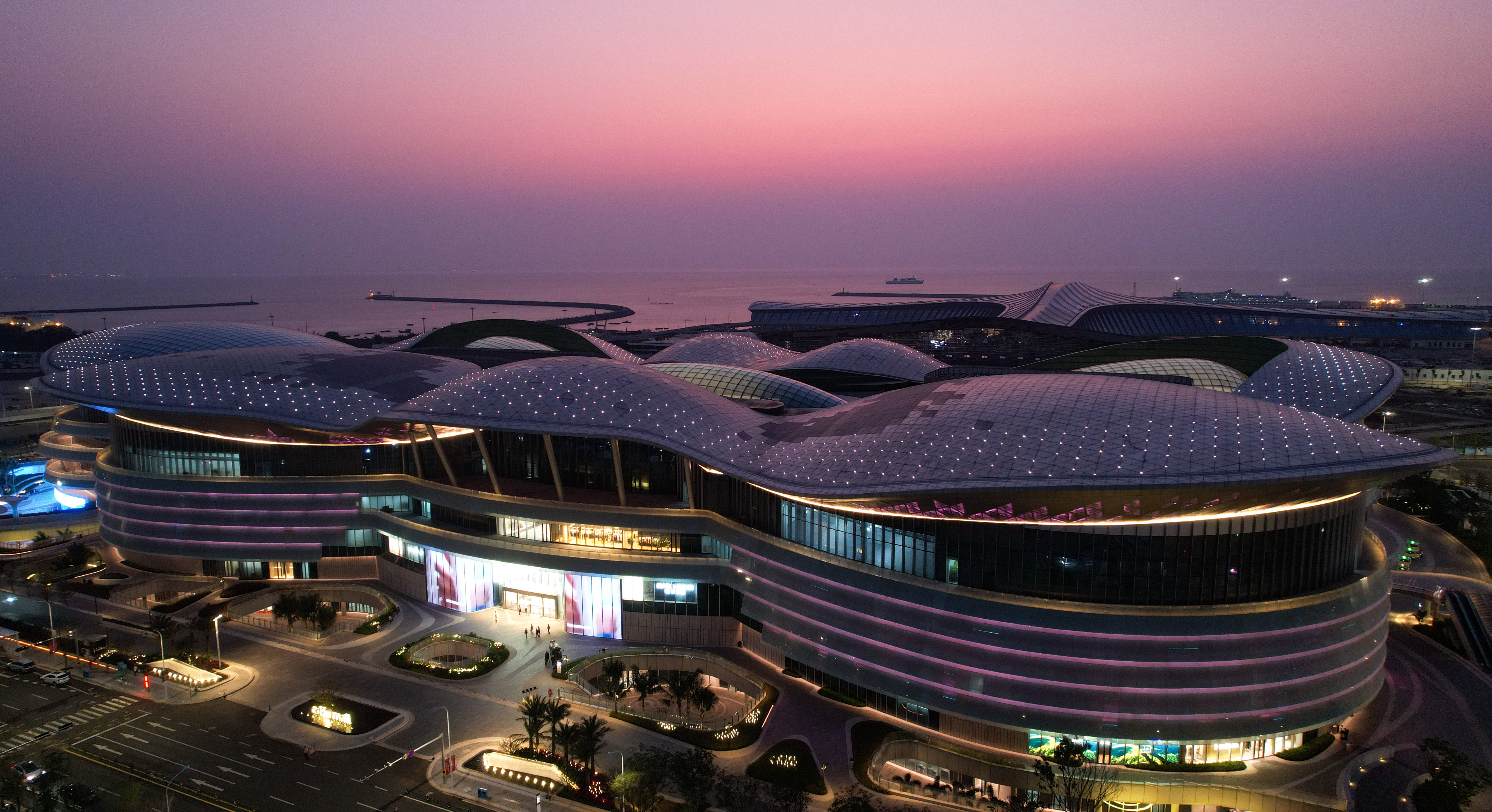 夜色中的海口国际免税城(前)和海口新海港客运综合枢纽项目(后)(4月4日摄,无人机照片)。新华社记者 杨冠宇 摄