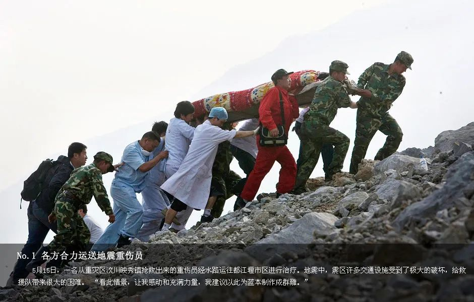 有人写下是汶川地震救援现场,在满地荒凉中,那如同一面旗帜飘扬的人们。