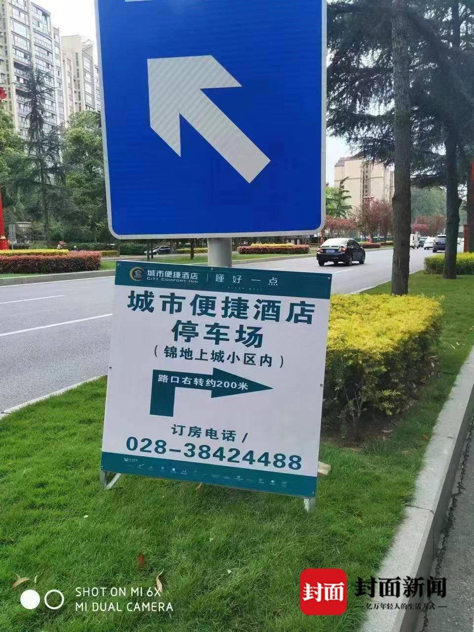 锦地上城小区业主张先生,向记者展示了不久前拍摄的照片,内容为城市便捷酒店和谭鸭血火锅店在路边立起了停车场指示牌。该指示牌上明确标注为“城市便捷酒店停车场(锦地上城小区内),路口右转约200米。”标牌上还标有两店的订房电话和订餐电话。