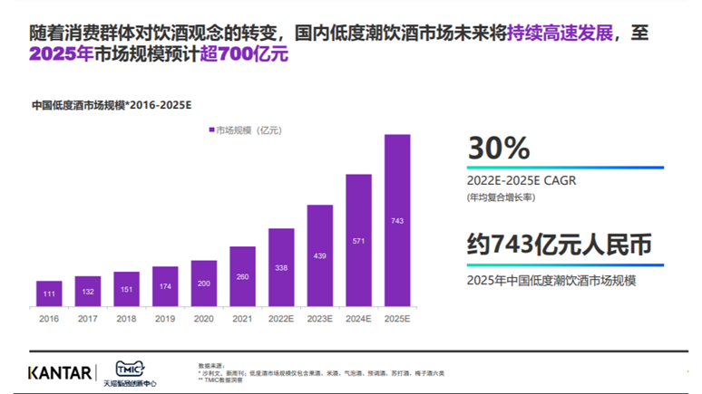 低度酒品类就是近年来随着消费者的趋势而生的品类。尼尔森早在《2021食品行业消费趋势洞察》指出,低度酒成为大食品行业新趋势崛起中的七大品类之一。TMIC&凯度发布的2022年低度酒趋势报告预测,至2025年,低度酒市场规模预计超700亿元。