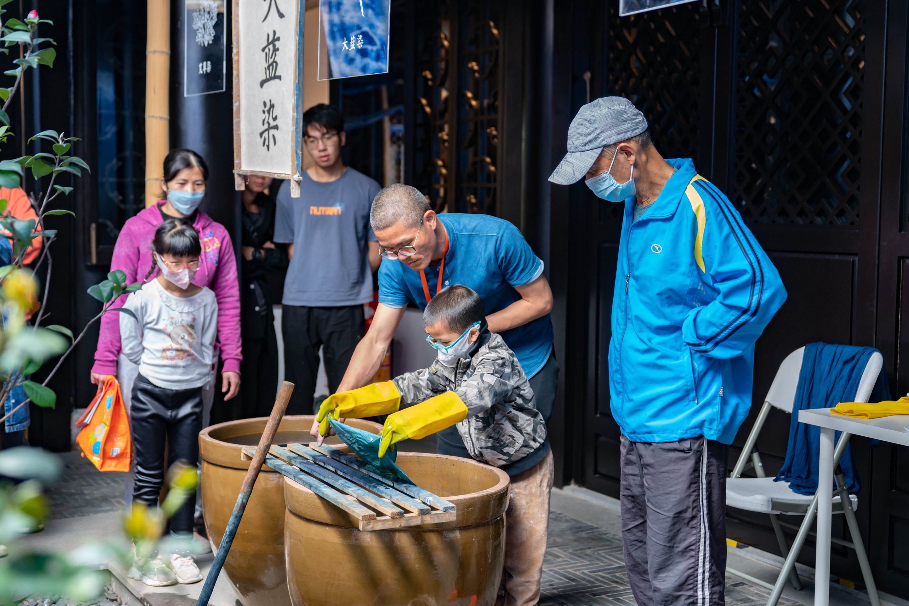 群众在“阑干斑布——彩云之南”板块体验蓝印花布印染技艺。