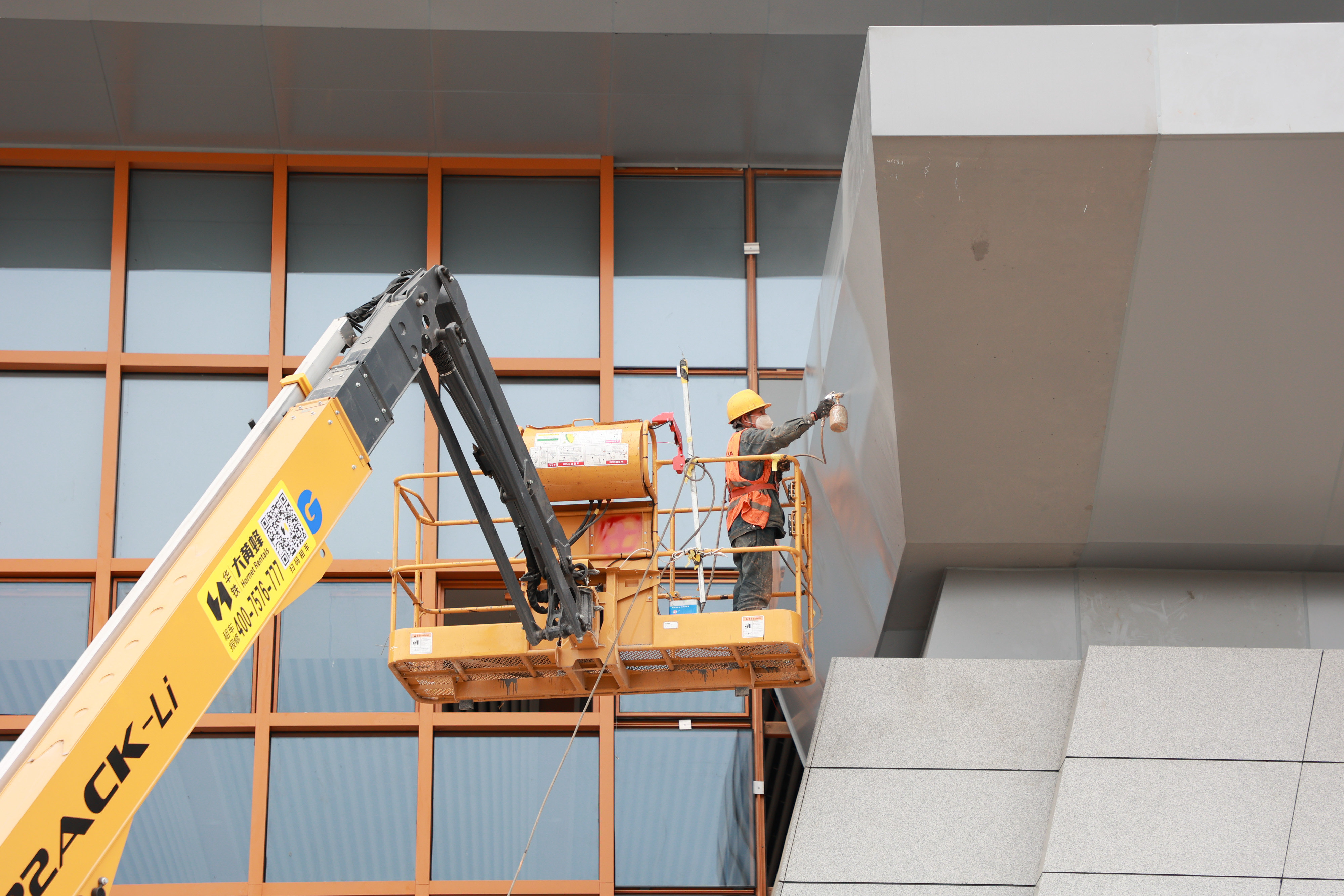 4月9日,工人对外立面面板进行喷漆。新华社记者 刘续 摄