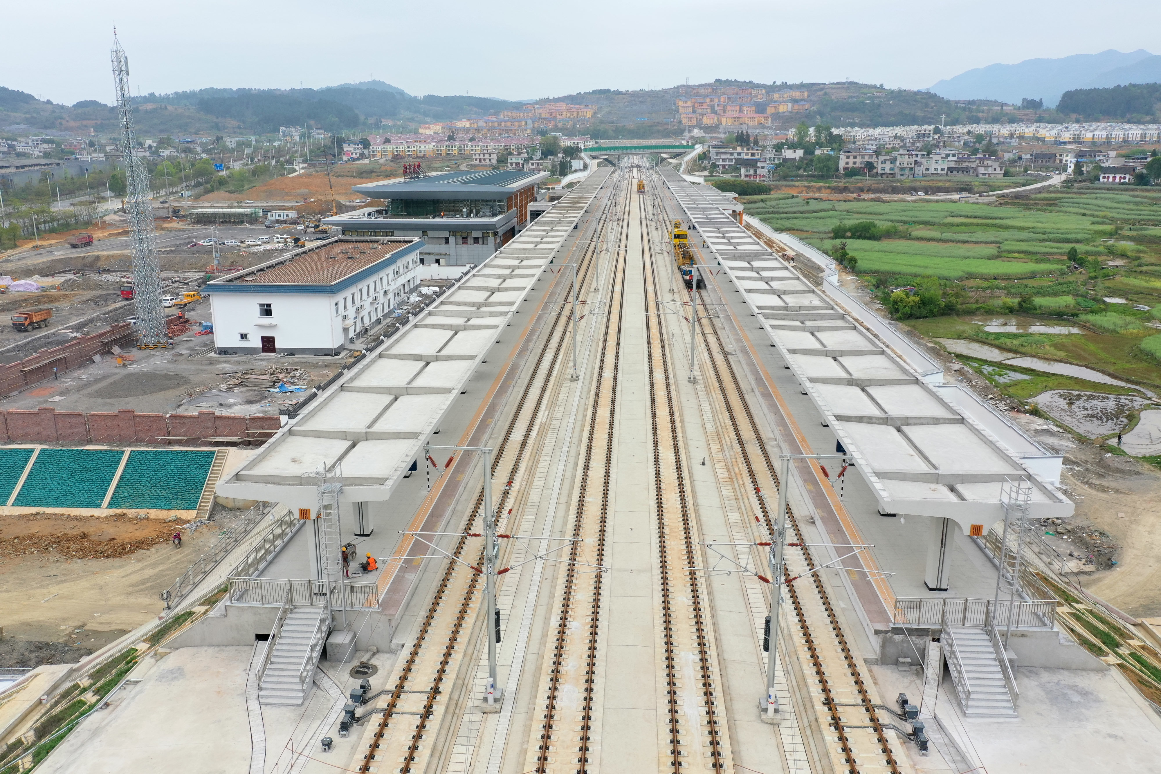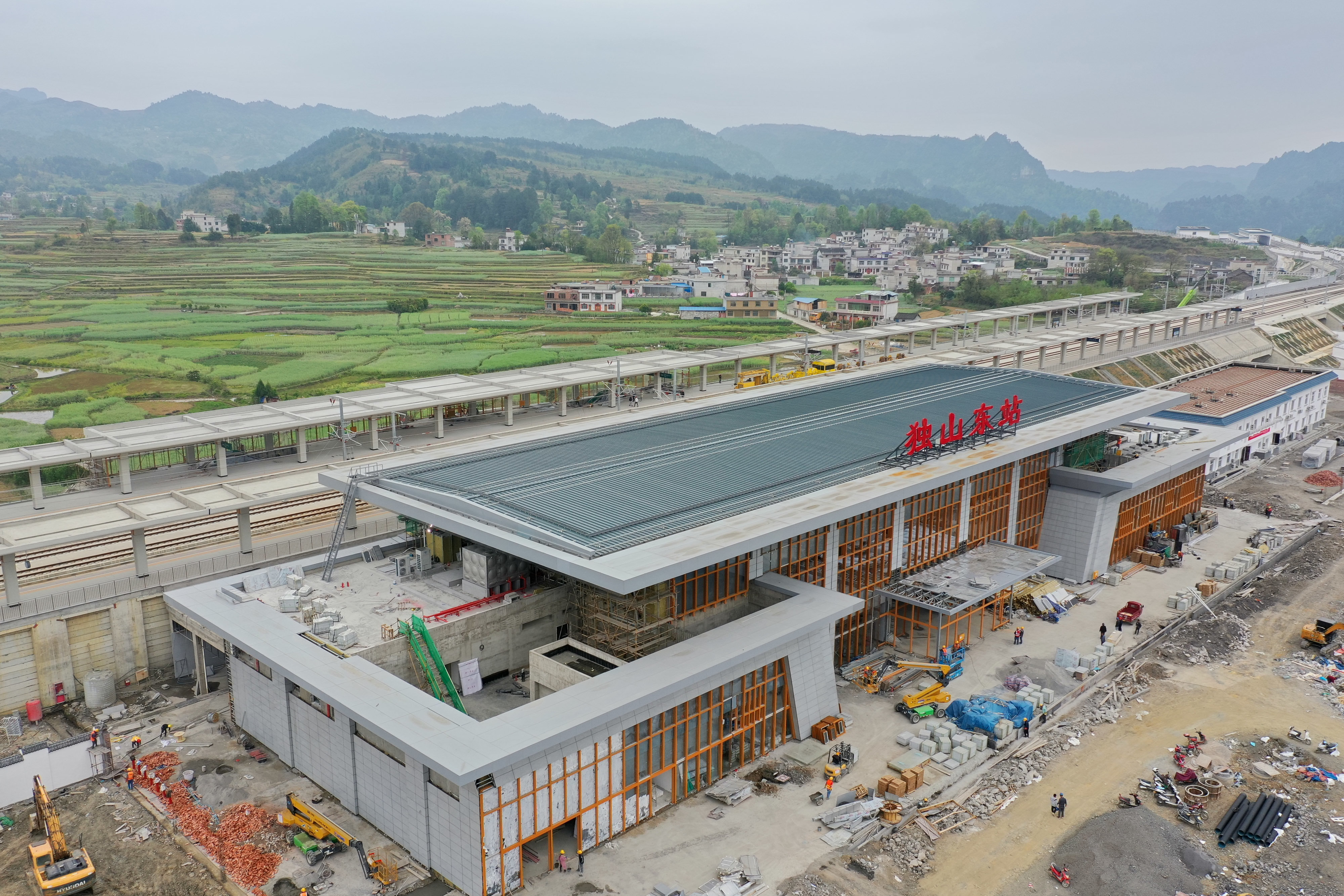 4月9日,独山东站在紧张施工当中(无人机照片)。新华社记者 刘续 摄