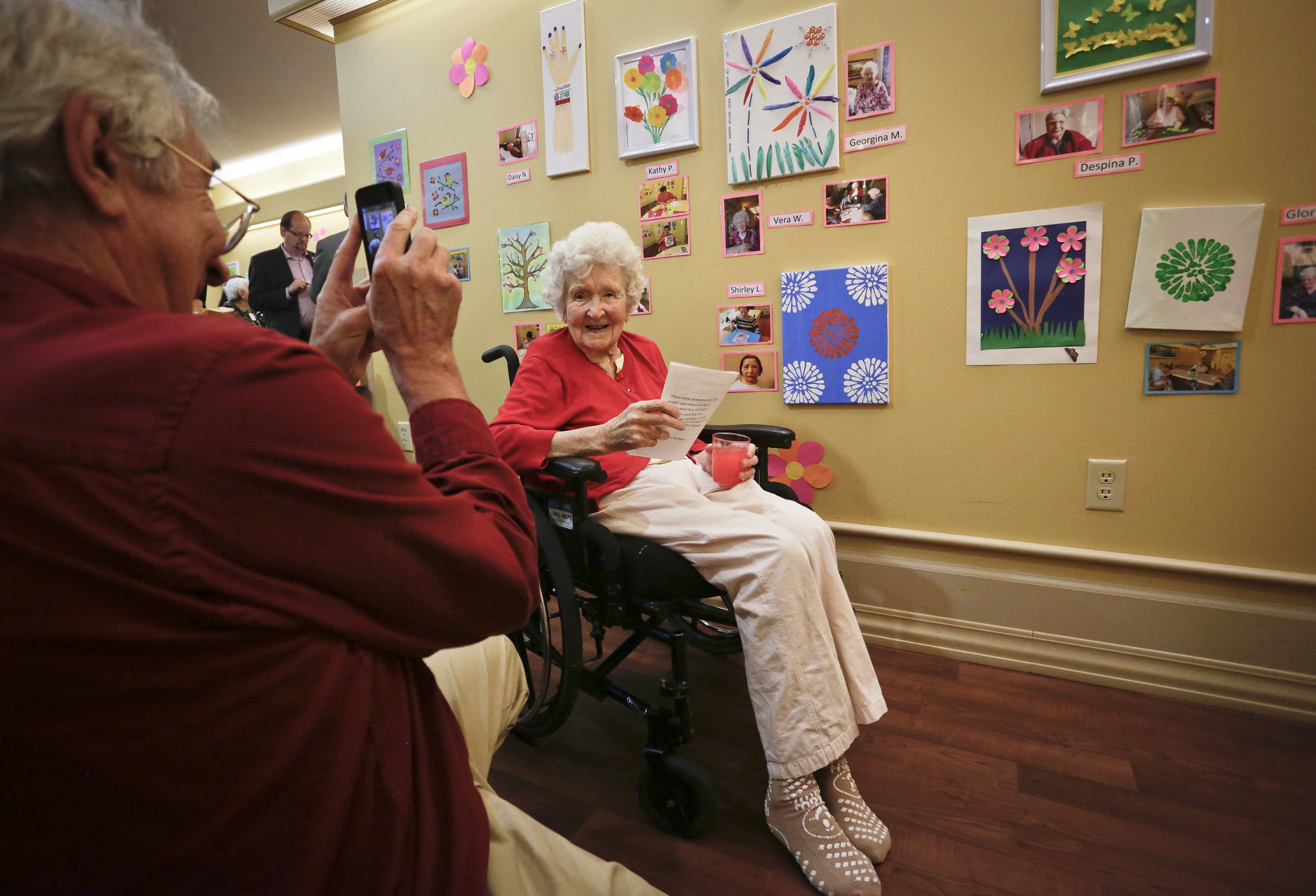 2015年9月2日, 在加拿大温哥华附近的新西敏市,一名阿尔茨海默病病人在画廊中与自己的画作合影。(新华社发)