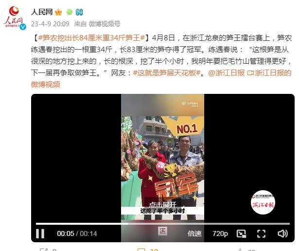 4月8日,在浙江龙泉的笋王擂台赛上,笋农练遇春挖出的一根重34斤,长83厘米的笋夺得了冠军。练遇春说:“这根笋是从很深的地方挖上来的,长的根深,挖了半个小时,我明年要把毛竹山管理得更好,下一届再争取做笋王。”网友:这就是笋届天花板。