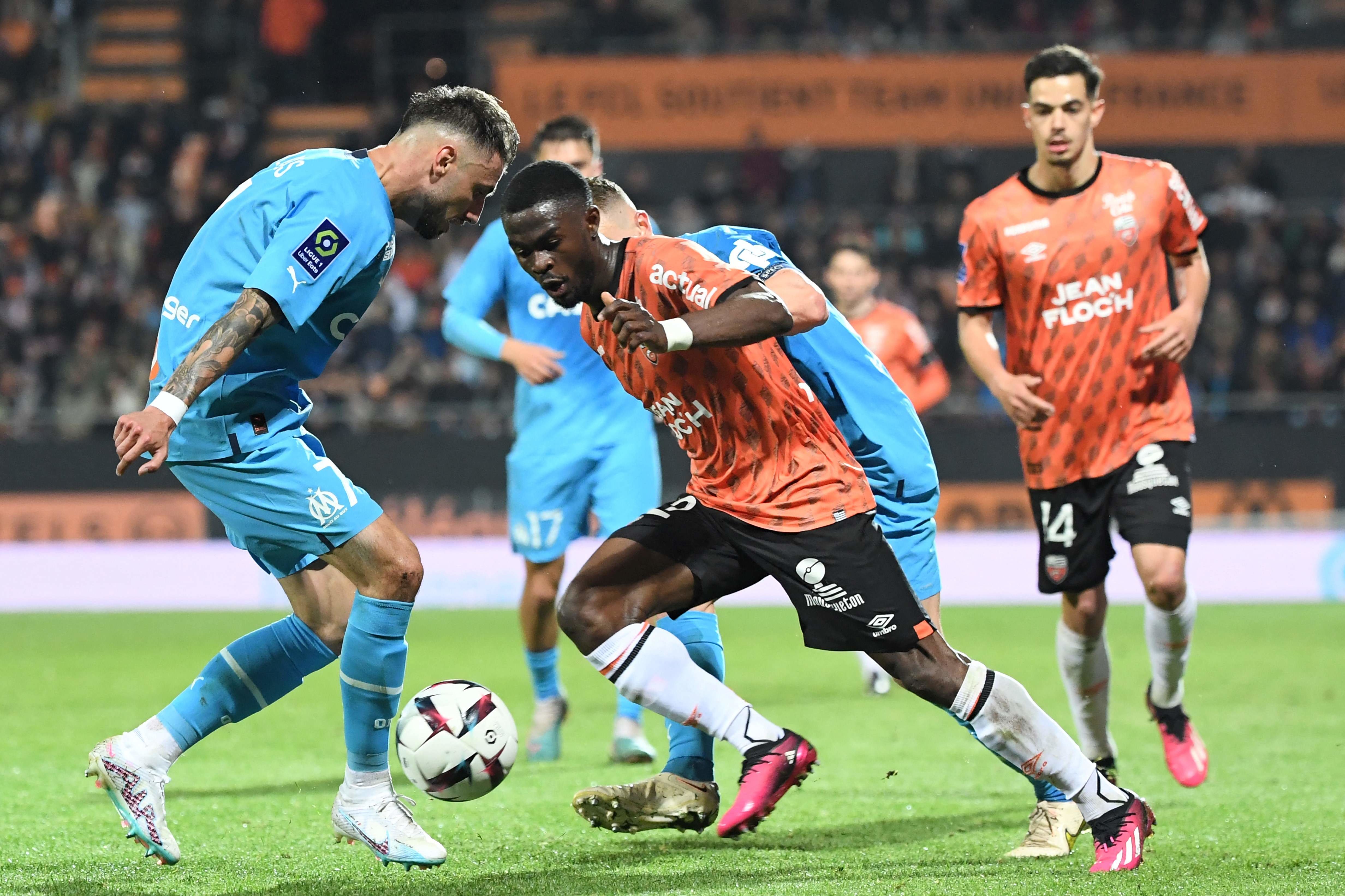 马赛与洛里昂球员在比赛中拼抢。新华社/法新