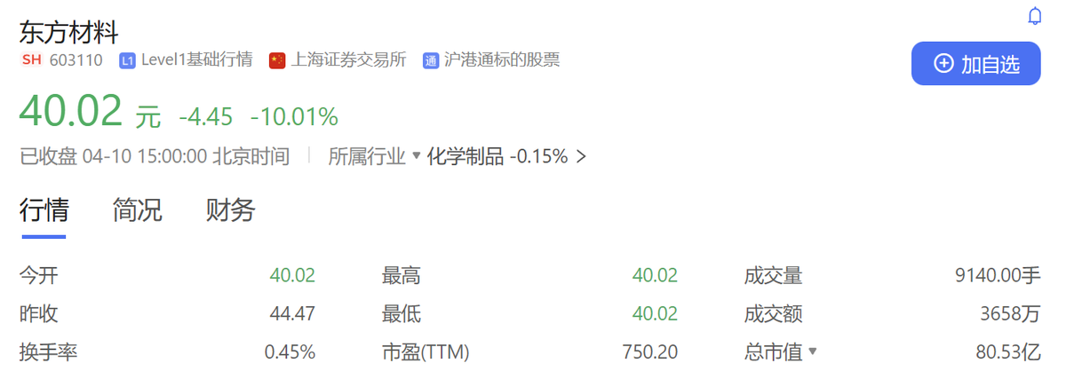 在华为深夜发布声明后,该收购案迅速成为网络热点。今日A股开盘后,东方材料(603110)一字跌停,跌幅超过10%,最终报价40.02元/股。