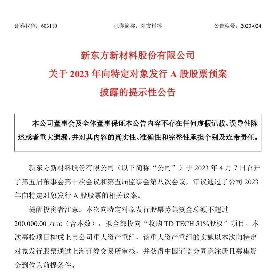 4月10日消息,在4月9日晚间,新东方新材料发布公告表示,拟通过定增募资 2000 万元方式,从诺基亚手中收购 TD TECH(鼎桥科技)51% 股权,交易价为21.216亿元。