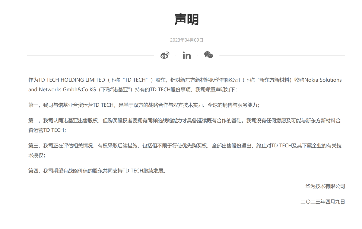 华为表示目前没有任何意愿及可能与新东方新材料合资运营TD TECH。