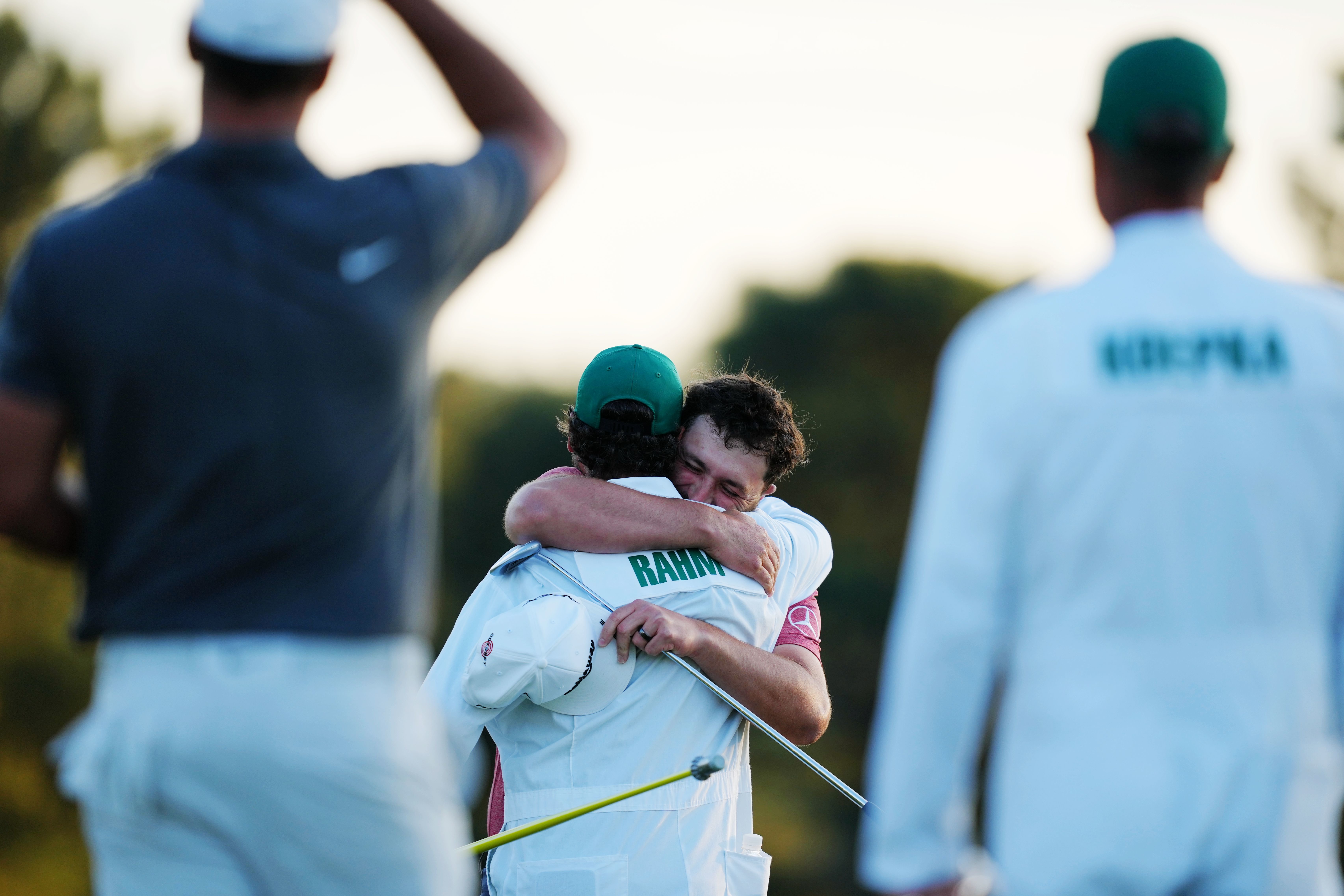 4月9日,西班牙选手琼·拉姆(右二)在完成最后一洞比赛后与球童拥抱庆祝胜利。新华社记者 吴晓凌 摄