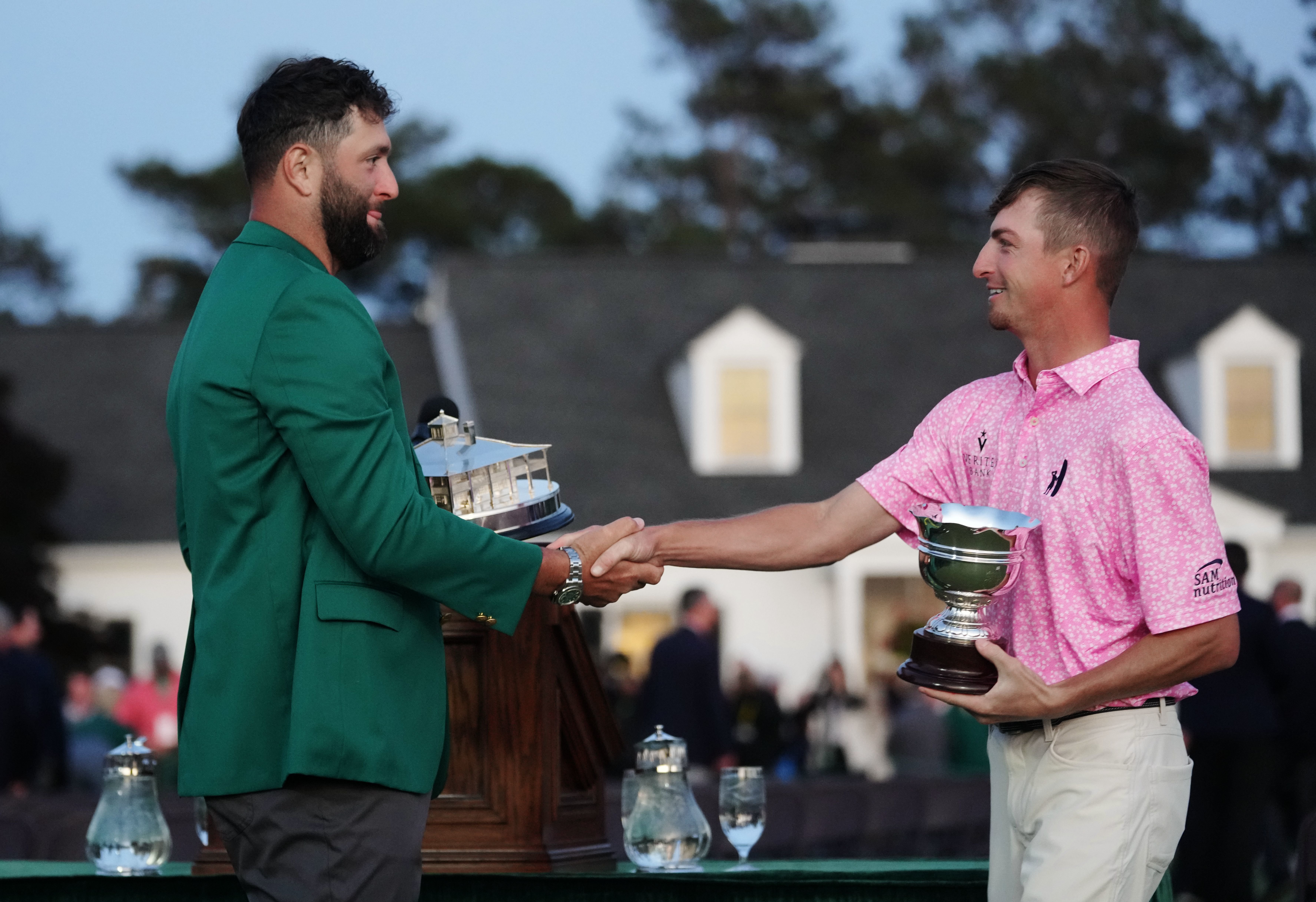 4月9日,本届美国大师赛冠军西班牙选手琼·拉姆(左)与获得最佳业余球员的美国选手山姆·贝内特在颁奖仪式上互相祝贺。新华社记者 吴晓凌 摄