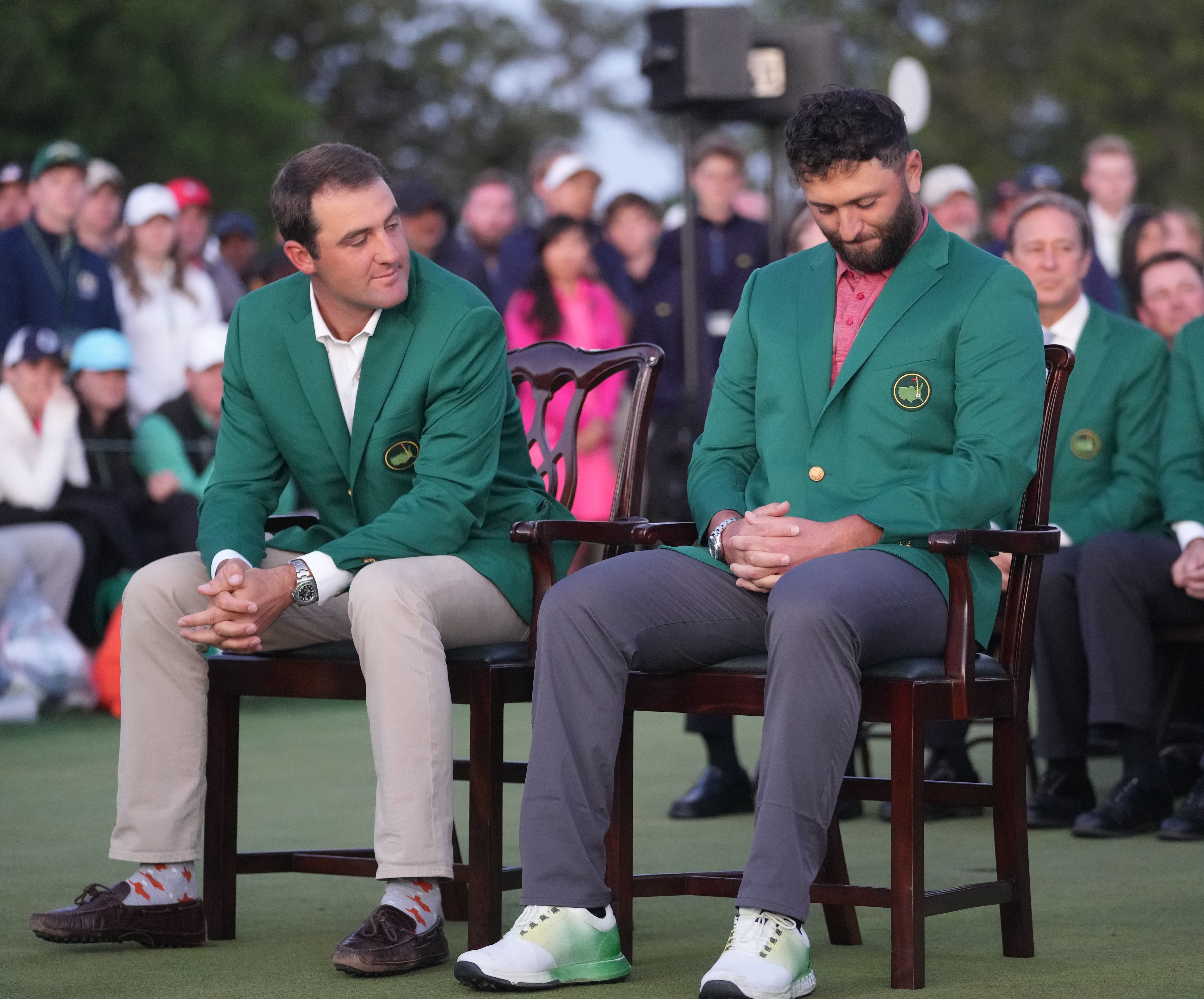 4月9日,上届美国大师赛冠军、美国选手斯科蒂·舍夫勒(左)与西班牙选手琼·拉姆出席颁奖仪式。新华社记者 吴晓凌 摄