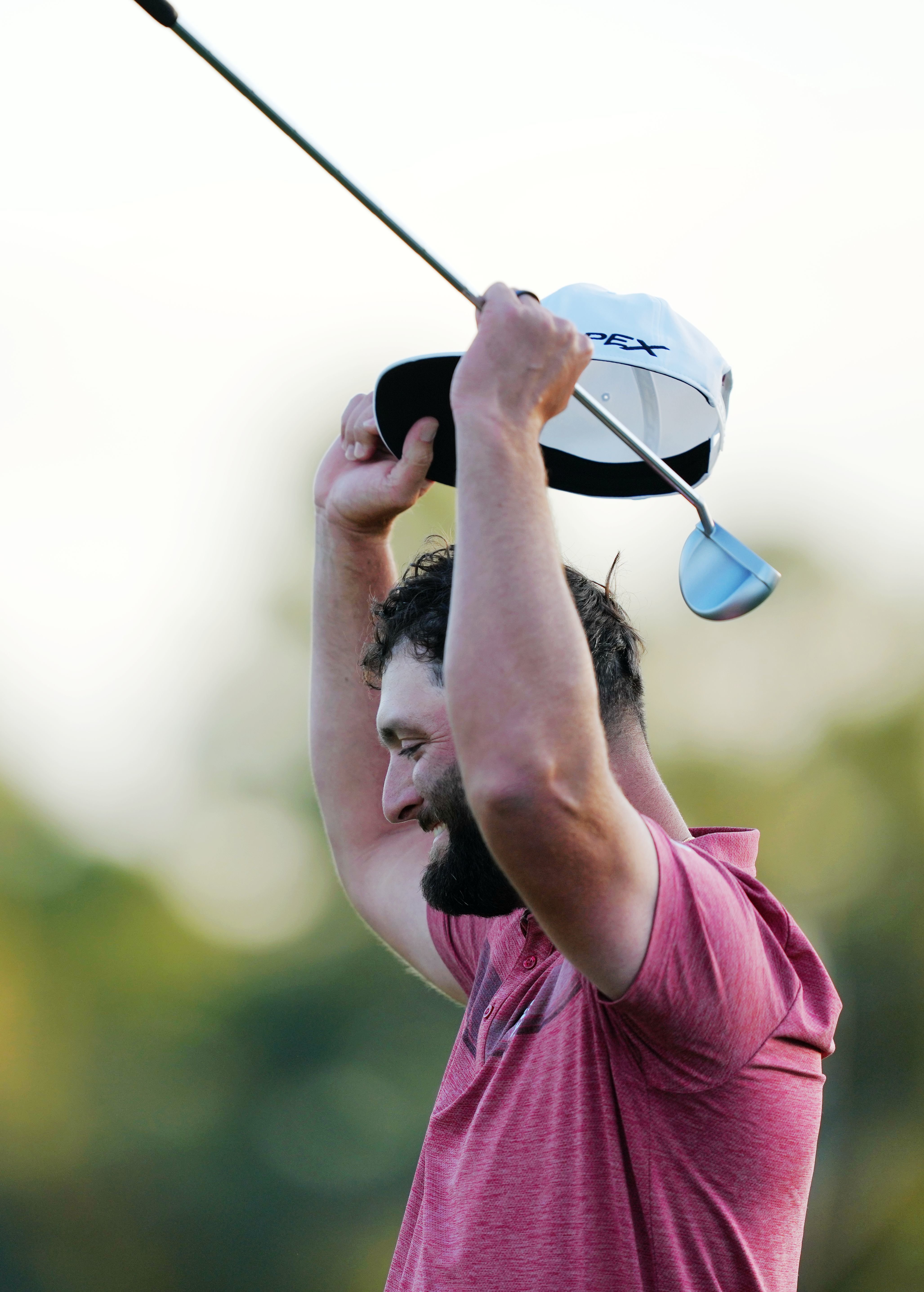 4月9日,西班牙选手琼·拉姆在完成最后一洞比赛后庆祝胜利。新华社记者 吴晓凌 摄