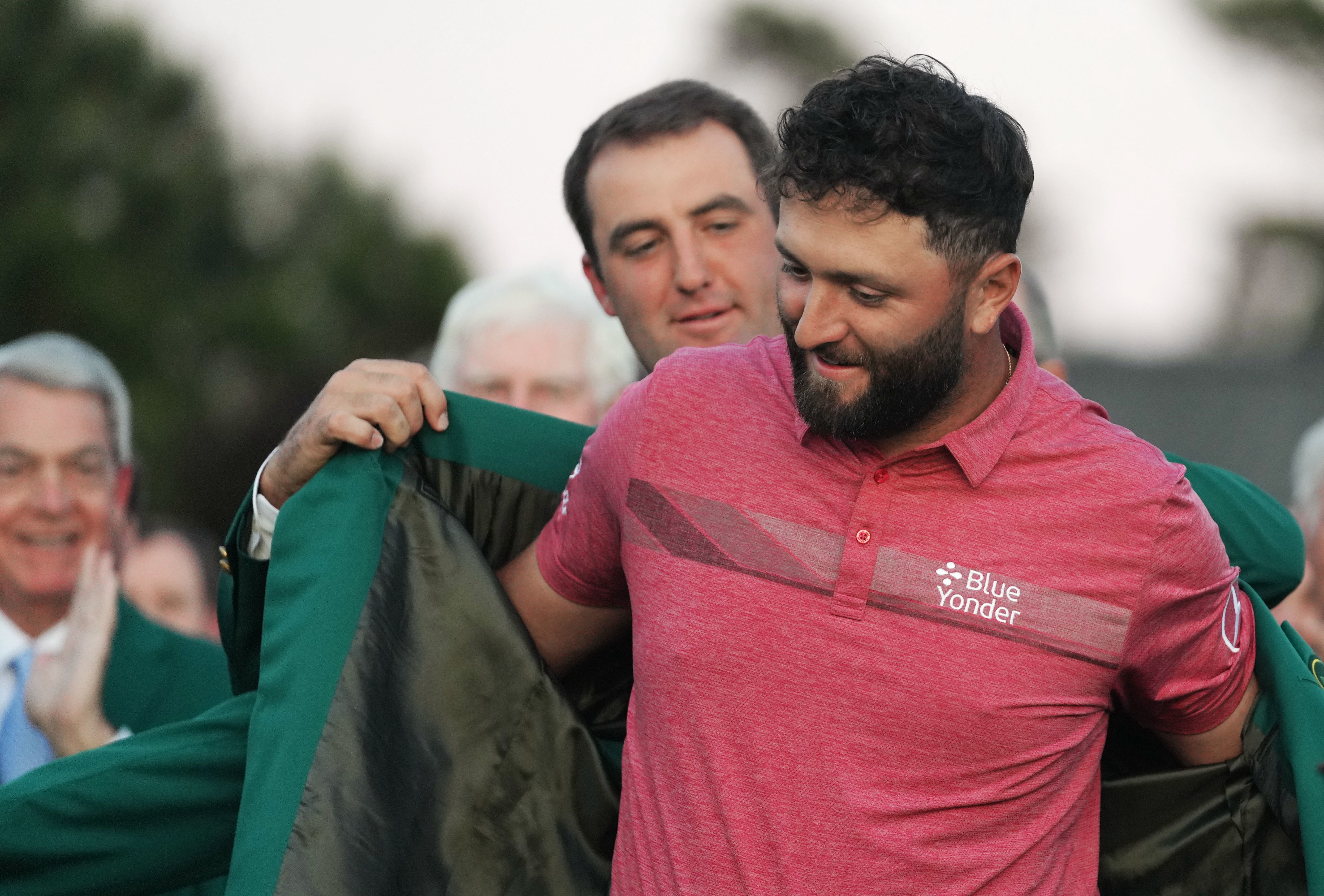 4月9日,上届美国大师赛冠军、美国选手斯科蒂·舍夫勒为西班牙选手琼·拉姆(前)穿上冠军绿夹克。新华社记者 吴晓凌 摄