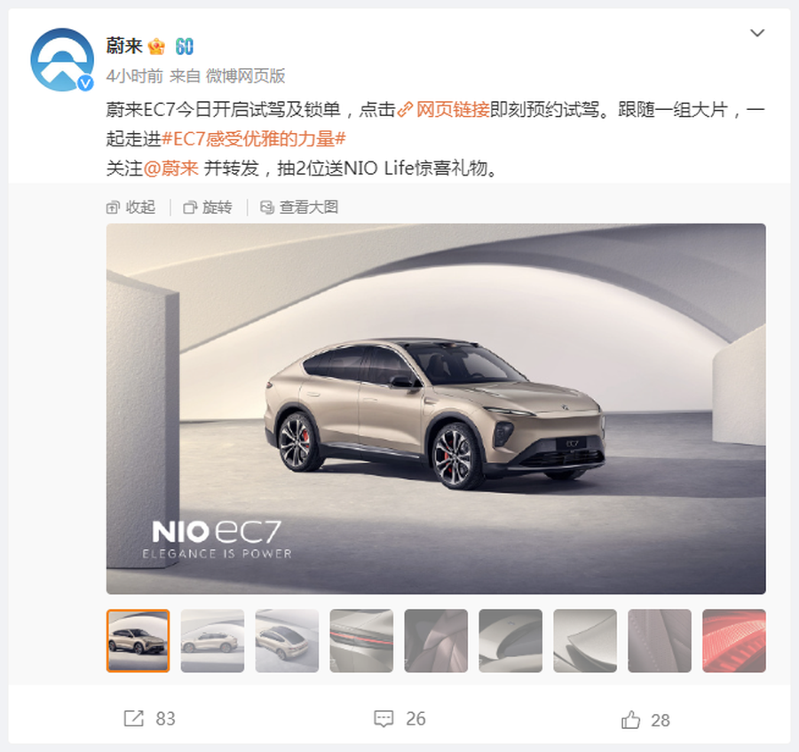 来自蔚来官方微博的消息,蔚来EC7今日开启试驾及锁单。该车预计将于今年5月份开启交付。