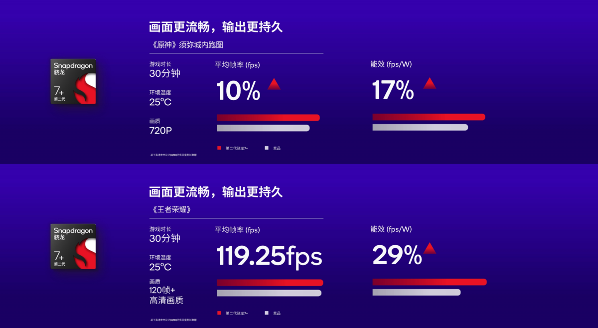 在官方的实测下,搭载第二代骁龙7+ 移动平台的工程样机在 720P 的《原神》30 分钟须弥跑图下平均帧率相比竞品要高 10%,能效高 17%。《王者荣耀》的 120 帧+高清画质测试,半小时平均帧率 119.25fps,能效相比竞品要高 29%。