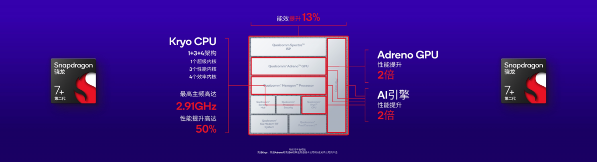 首先了解一下第二代骁龙7+ 移动平台,采用1+3+4 架构,全新的 Kryo Prime 超级内核最高主频可以达到 2.91GHz,带来 50% 的性能提升,高通 Adreno GPU 性能也有 2 倍的提升。综合下来,第二代骁龙7+ 移动平台可以带来 13% 的综合能效提升。