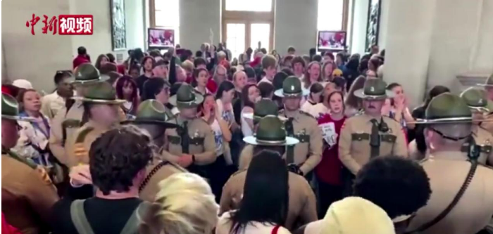 视频截图:美国田纳西州2名议员呼吁控枪被赶出议会,引民众抗议。