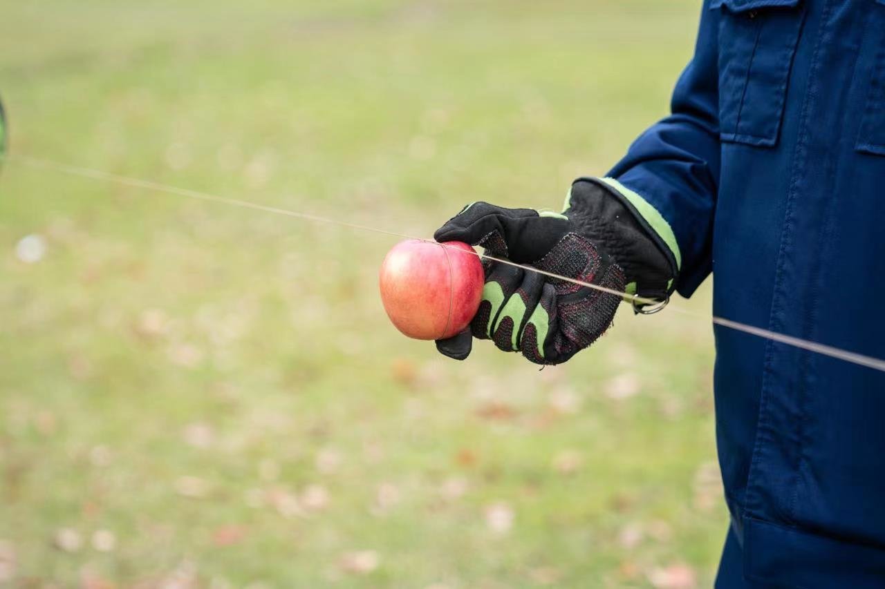 一根纤细的风筝线到底有多大威力?上海金山区消防救援支队专门做了一次实验。4月11日上午,在一处空旷的草坪上,聚集了不少风筝爱好者。消防人员戴好手套,握住一只苹果,风筝线轻轻一拉,苹果瞬间就被切成两截。