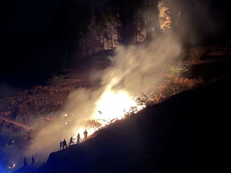 夜幕降临后,山上的火线和浓烟清晰可见。现场偶有阵风,火线顺着山势燃烧,不断发生变化,而在扑救现场,火光中闪动着的一个个橙色身影,铸成了森林火灾扑救一线最坚实的一道防线。