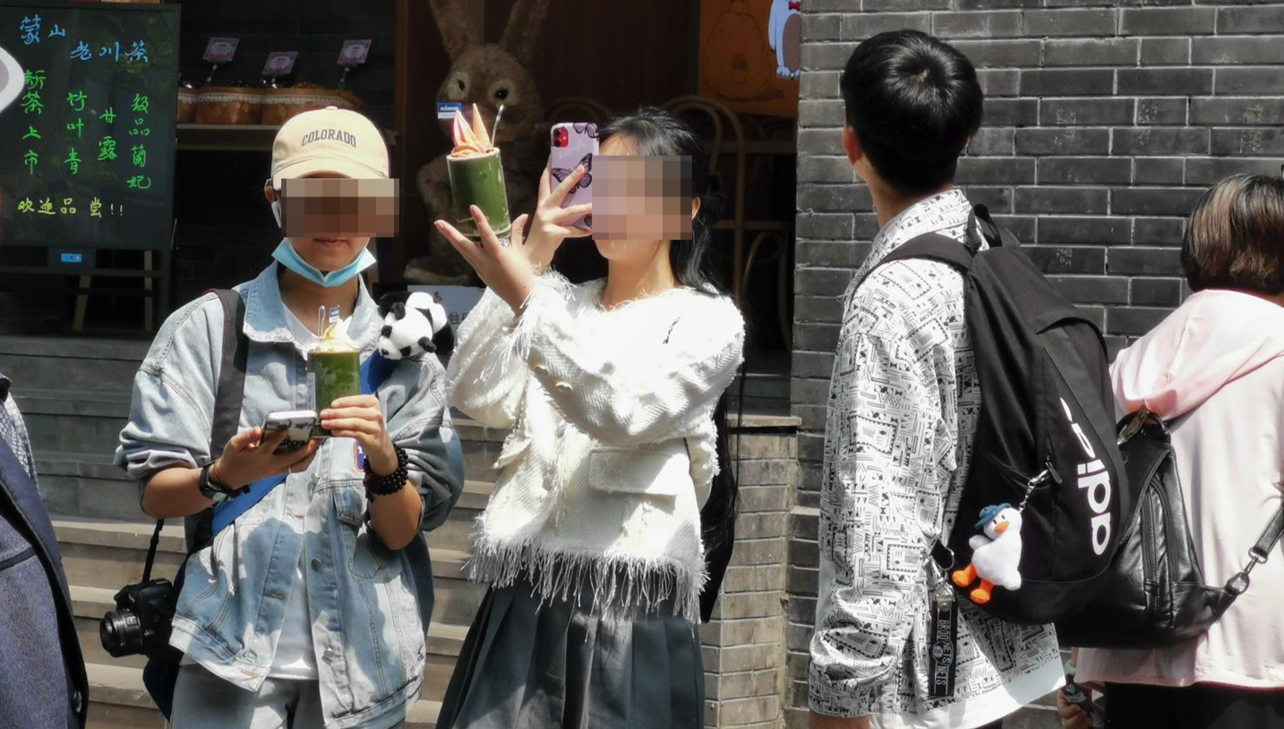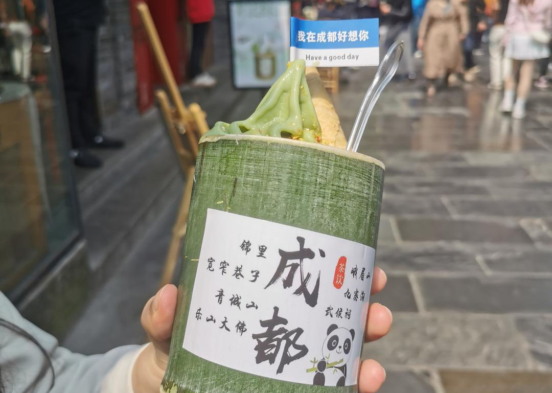 4月10日,成都白天的气温已经高达20多摄氏度,街头不少市民穿着短袖。中午时分,宽窄巷子景区人头攒动,但是只要在人群中走几步,就能看到手捧竹筒的游客。这些竹筒里装的不是饭,而是冒着奶油尖尖的特色奶茶或者冰淇淋。