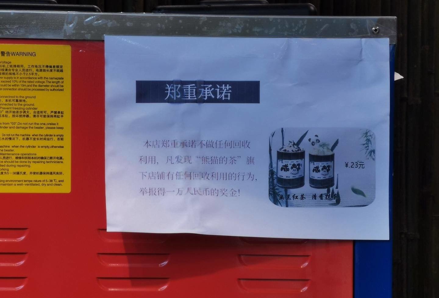 此外,记者在一家竹筒奶茶店看到,商家贴出告示称,“本店郑重承诺不做任何回收利用”,若市民发现店铺有回收利用的行为,举报可得一万元奖金。