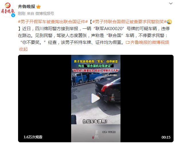 近日,四川绵阳警方接到举报,一辆“联军AK00020”号牌的可疑车辆,违停在路边。见到民警,驾驶人态度嚣张,声称是“联合国”车辆,不停要求民警:“你不要笑。”经查,该男子所持车牌、证件均为假冒。