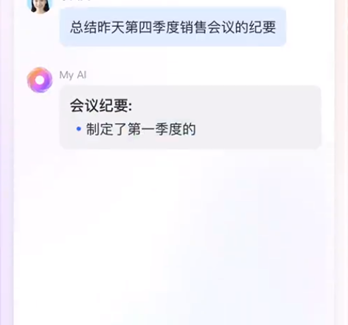 从官方演示来看,My AI类似微软推出的Office Copilot,可为用户做会议纪要、自动创办待办事项、一键整理销售报告、对齐 OKR 等等,均通过自然语言交互完成。