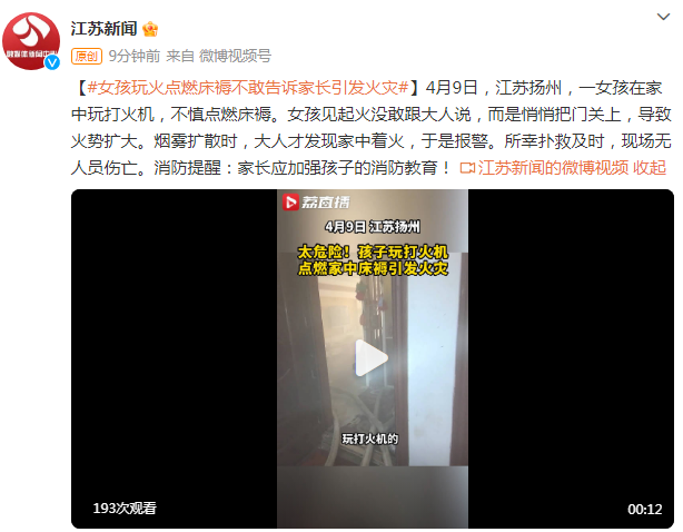 4月9日,江苏扬州,一女孩在家中玩打火机,不慎点燃床褥。女孩见起火没敢跟大人说,而是悄悄把门关上,导致火势扩大。烟雾扩散时,大人才发现家中着火,于是报警。所幸扑救及时,现场无人员伤亡。消防提醒:家长应加强孩子的消防教育!