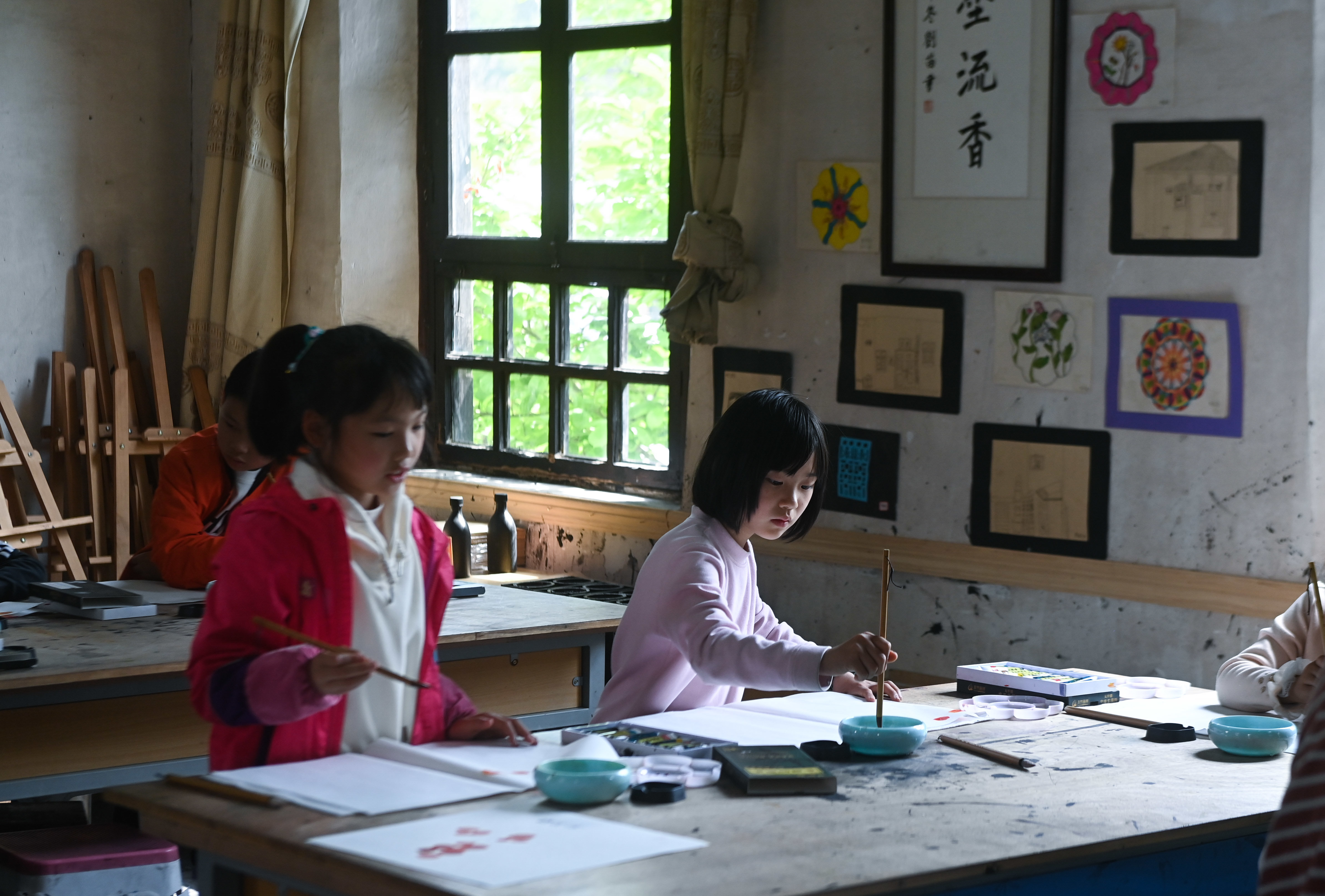 4月12日,诸暨市东白湖镇斯民小学的学生在上国画课。新华社记者 徐昱 摄