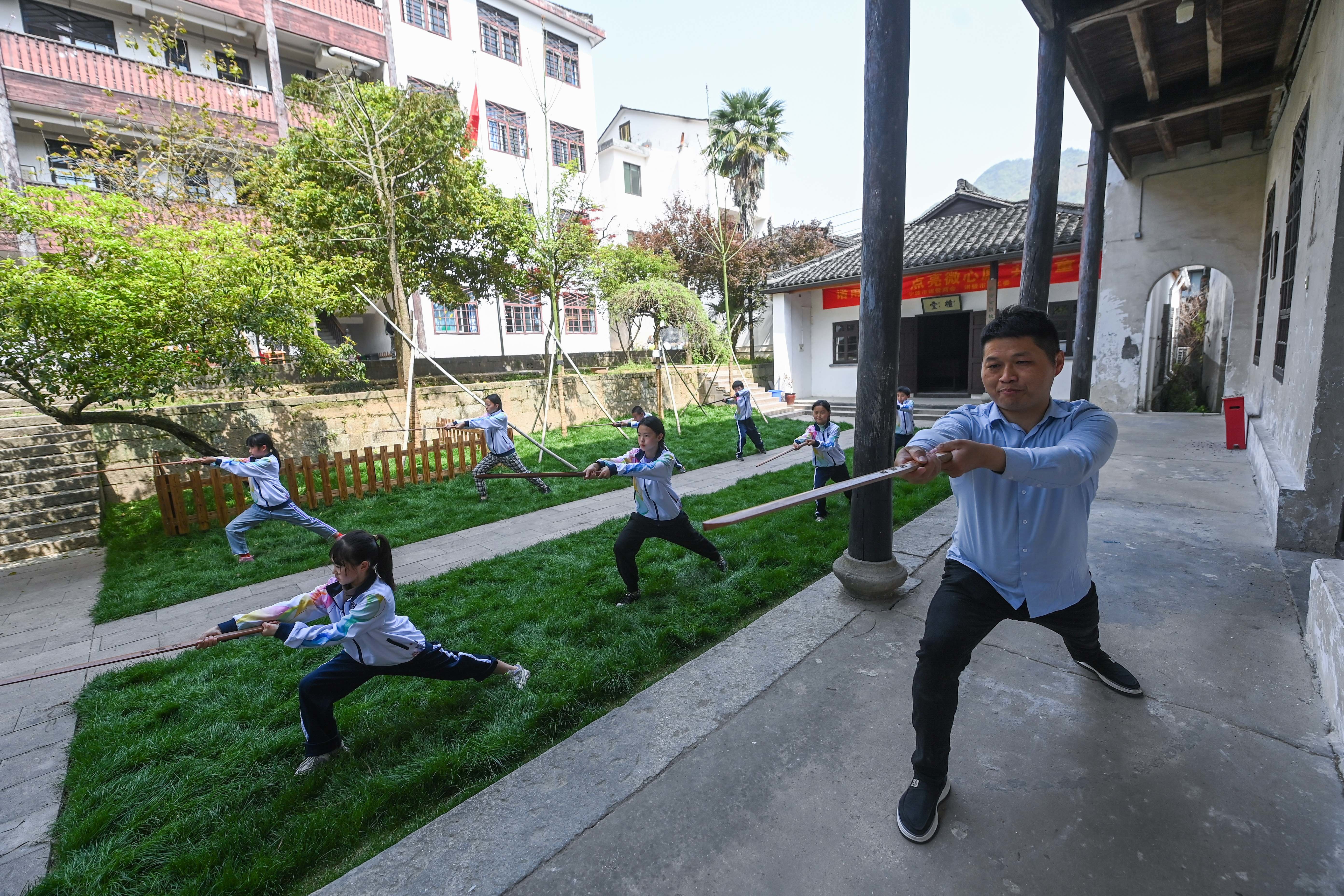 4月12日,诸暨市东白湖镇斯民小学的学生在学习传统武术舞剑。新华社记者 徐昱 摄