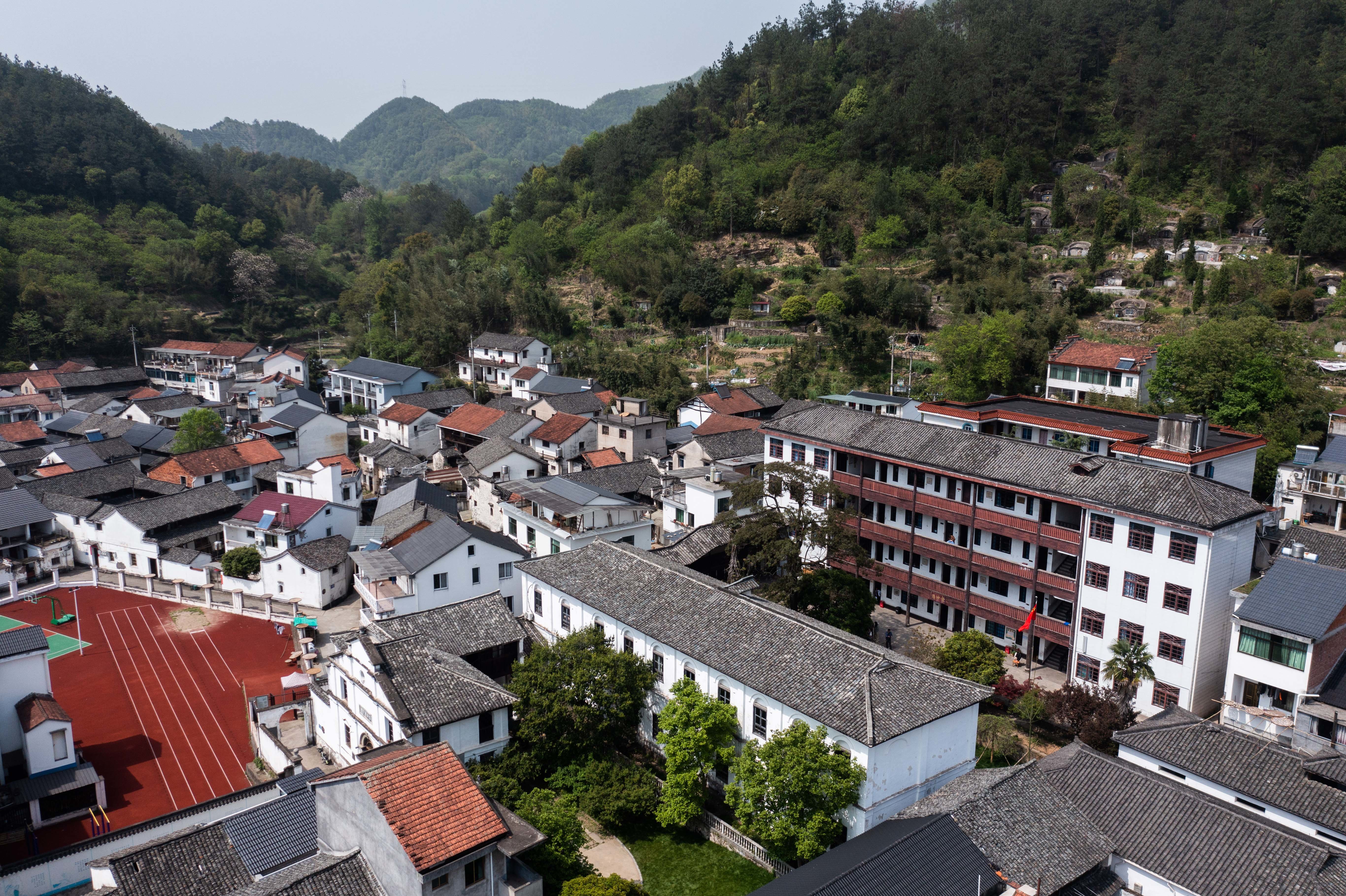 这是4月12日拍摄的诸暨市东白湖镇有着百年历史的斯民小学(无人机照片)。新华社记者 徐昱 摄