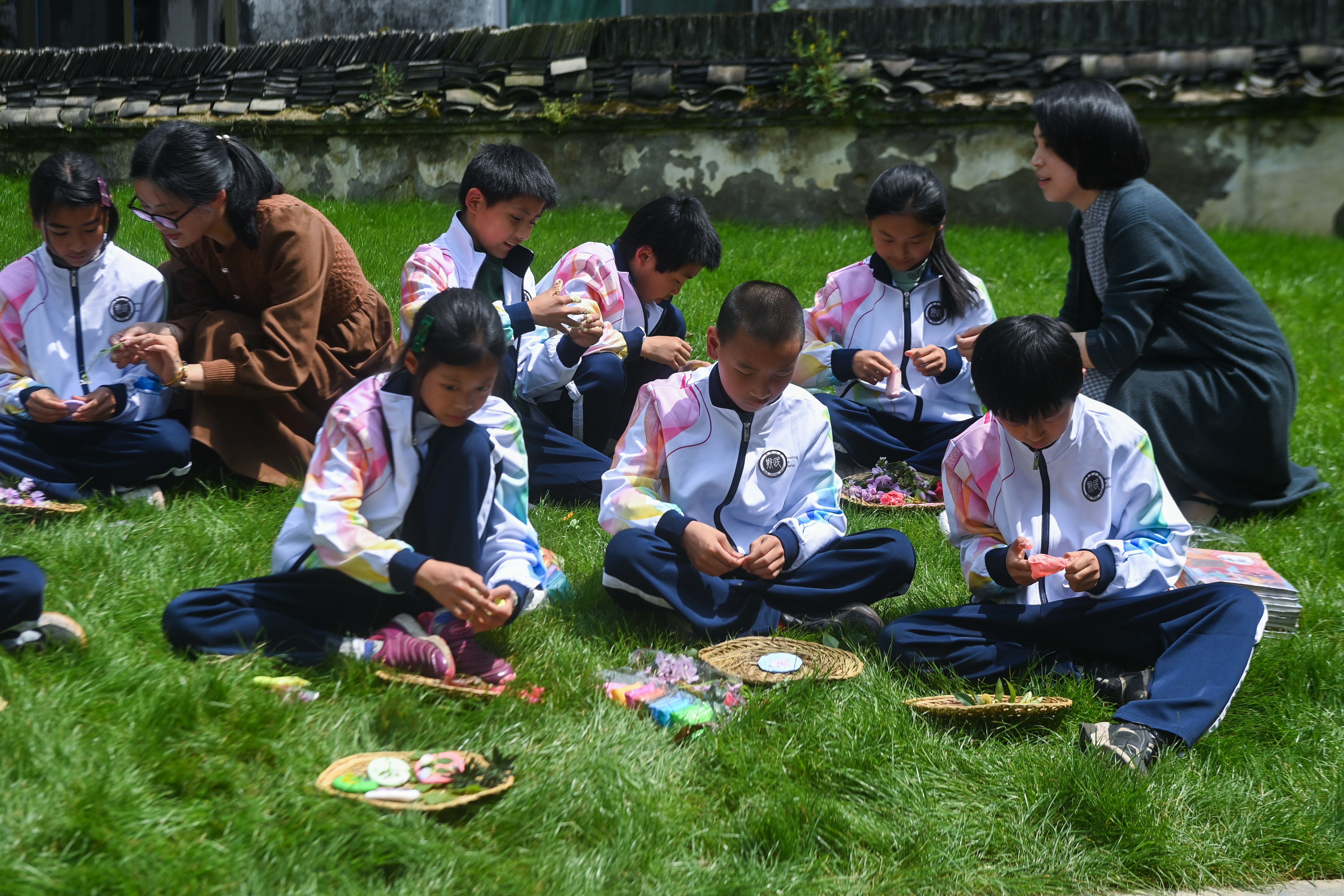 4月12日,诸暨市东白湖镇斯民小学的学生在“寻找春天的色彩课程”中制作花草画。新华社记者 徐昱 摄