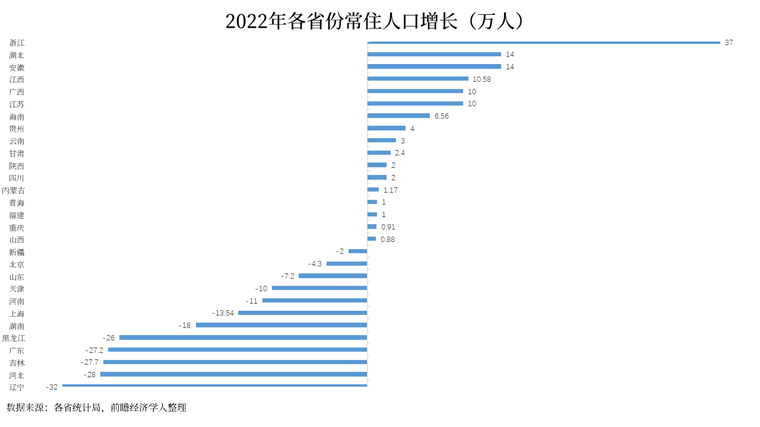 长三角并不是个例,有不少经济相对落后的中西部省份,在2022年出现了人口回流的趋势。总共看下来,全国至少17个省份常住人口正增长,至少13个省份处于人口净流入状态。