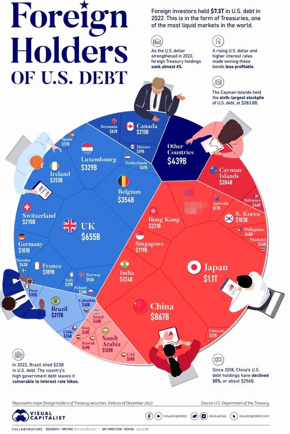 截止2022年底美债持有者。相比2020年3月,中国、日本、巴西、印度、沙特等国均减持了美债。