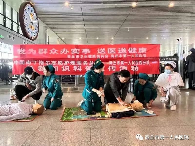 ——到商丘市高铁站开展急救科普宣传志愿服务活动。4月7日上午,中国南丁格尔志愿护理服务队商丘市第一人民医院分队,在商丘第一人民医院护理部主任邵春梅等带领下,走进商丘市高铁站开展了急救科普宣传志愿服务活动。活动现场,急诊科科护士长韩雪迎向广大群众讲解了现场急救的重要意义。急诊科杨洋详细讲解了观察患者体位、胸外按压、开放气道、人工呼吸等急救流程。急诊科李洁重点演示了单人徒手心肺复苏的急救技巧。随后急诊科董庆祝、杨莉、曹飞以及护理部干事何婷对AED除颤技术及海姆立克急救法进行了详细讲解和示范,对群众的困惑及现场操作进行了耐心解答和一对一指导。