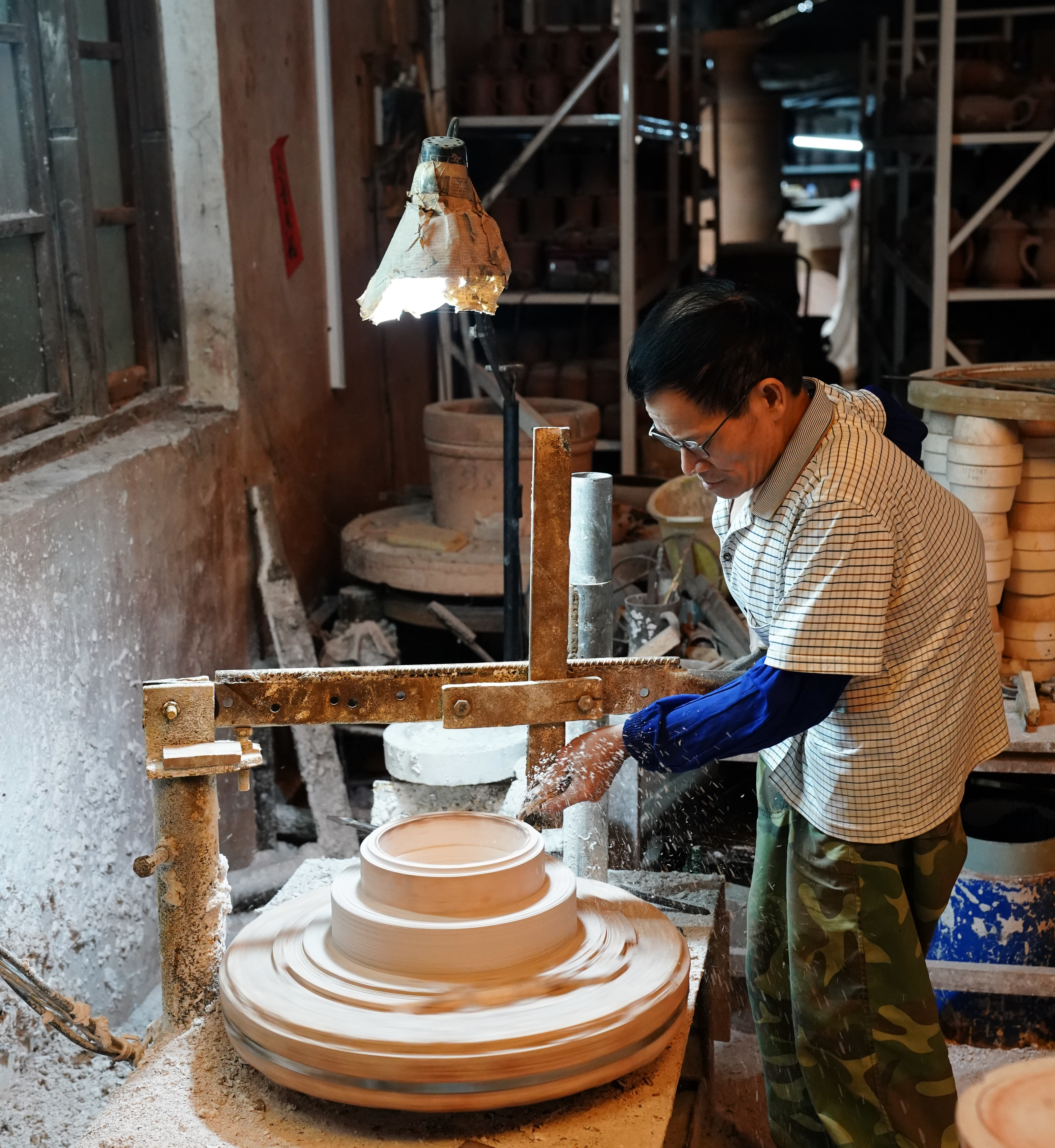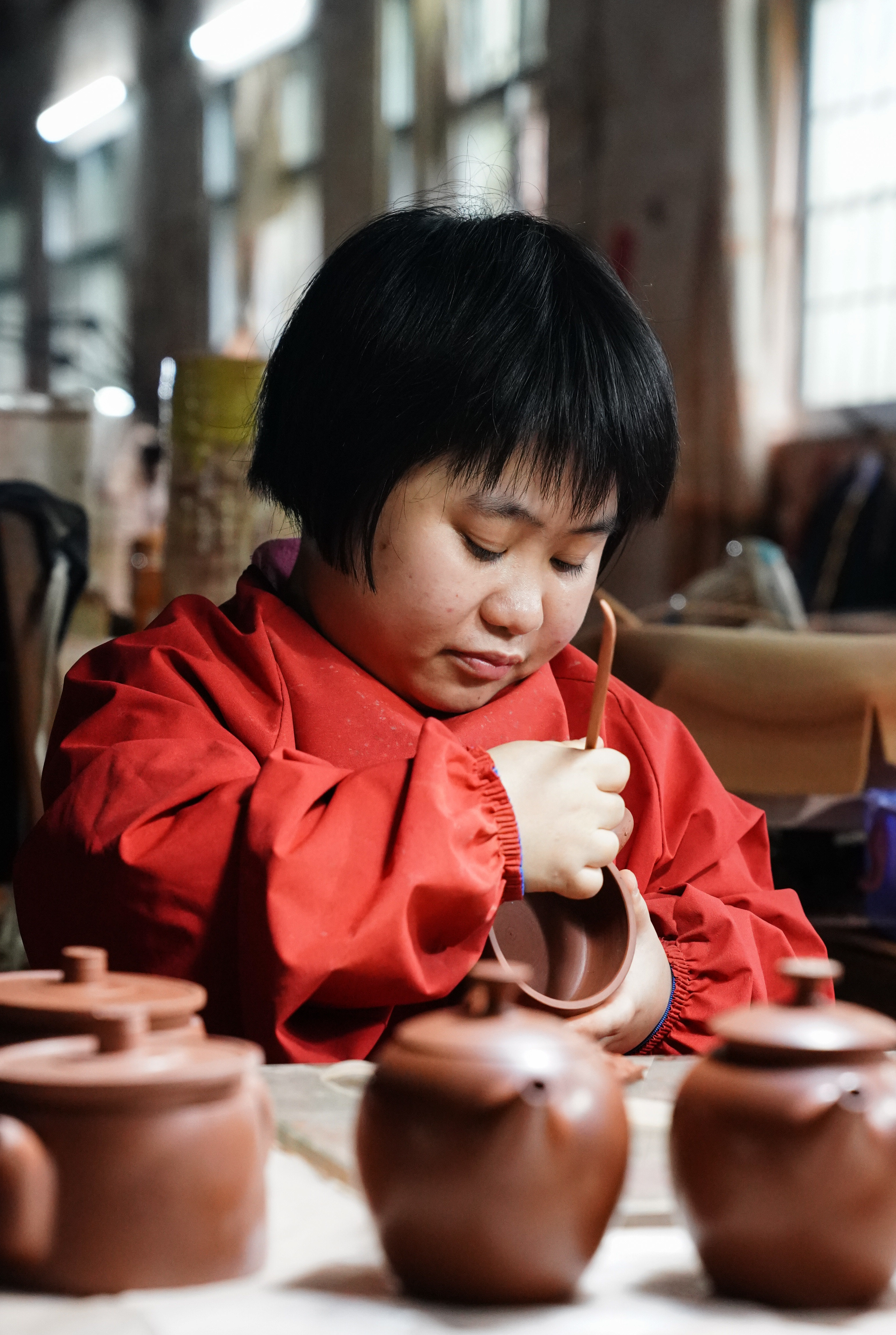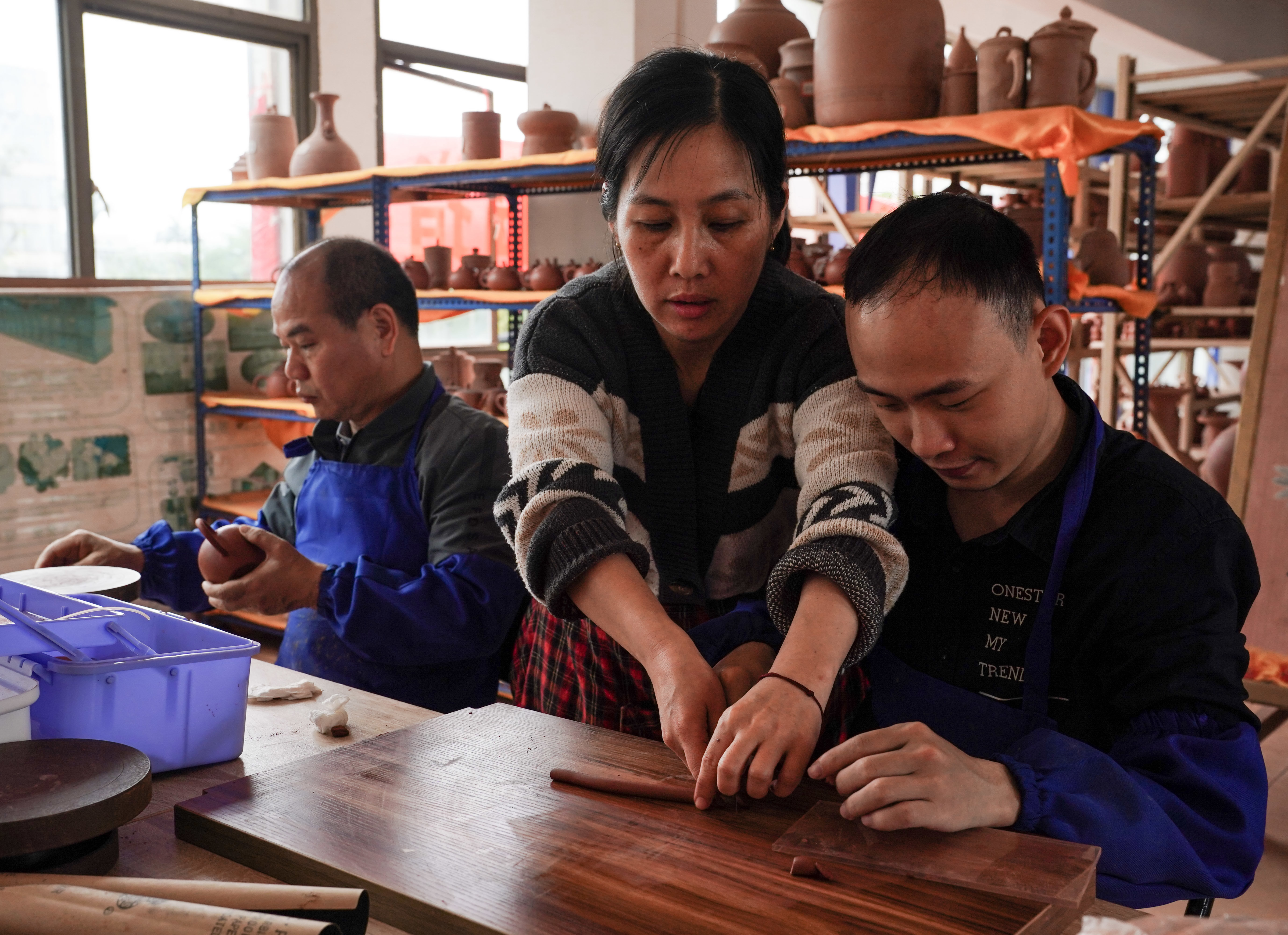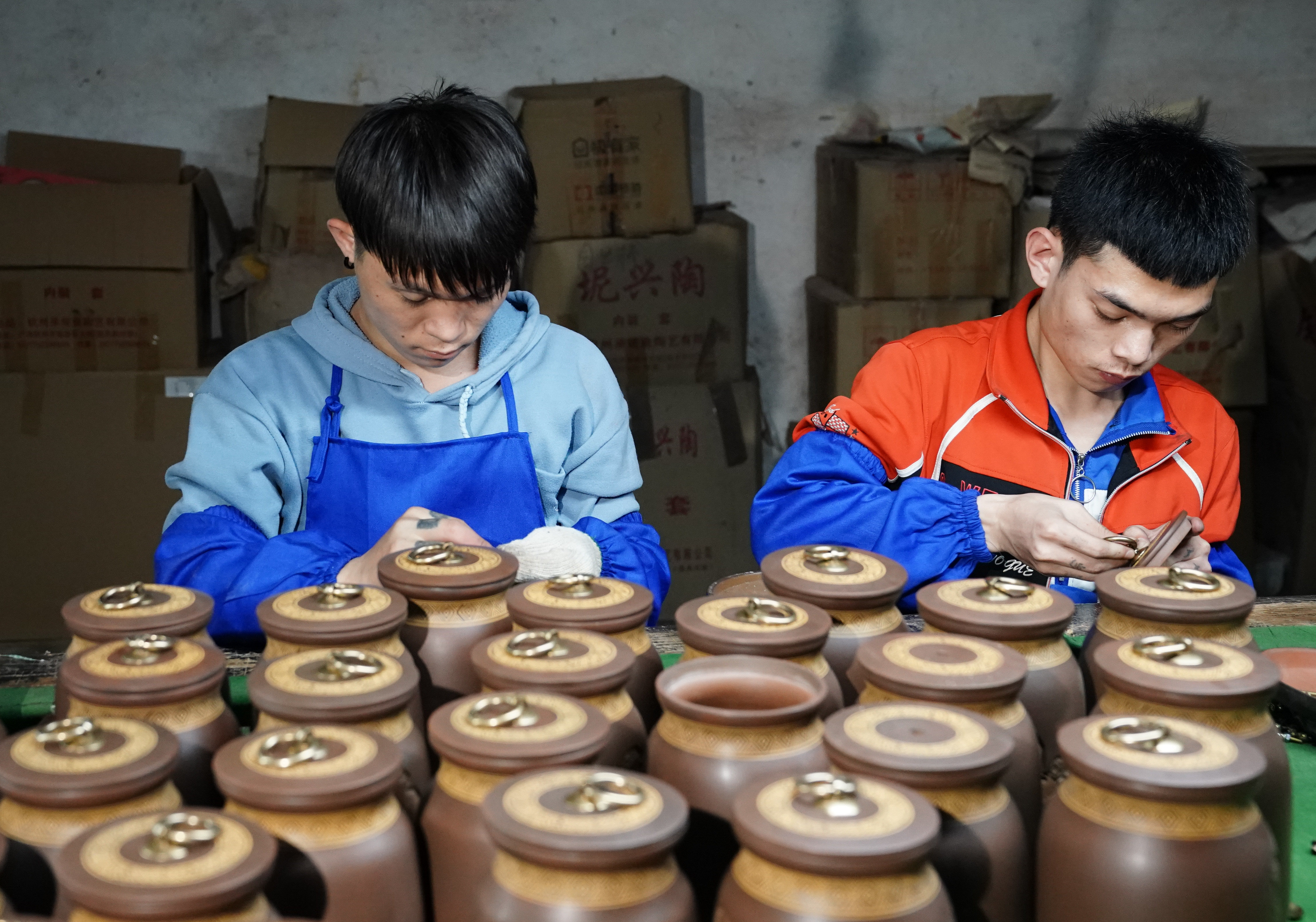 4月11日,在广西省钦州市,员工在坭兴陶生产车间工作。新华社记者 周佳谊 摄