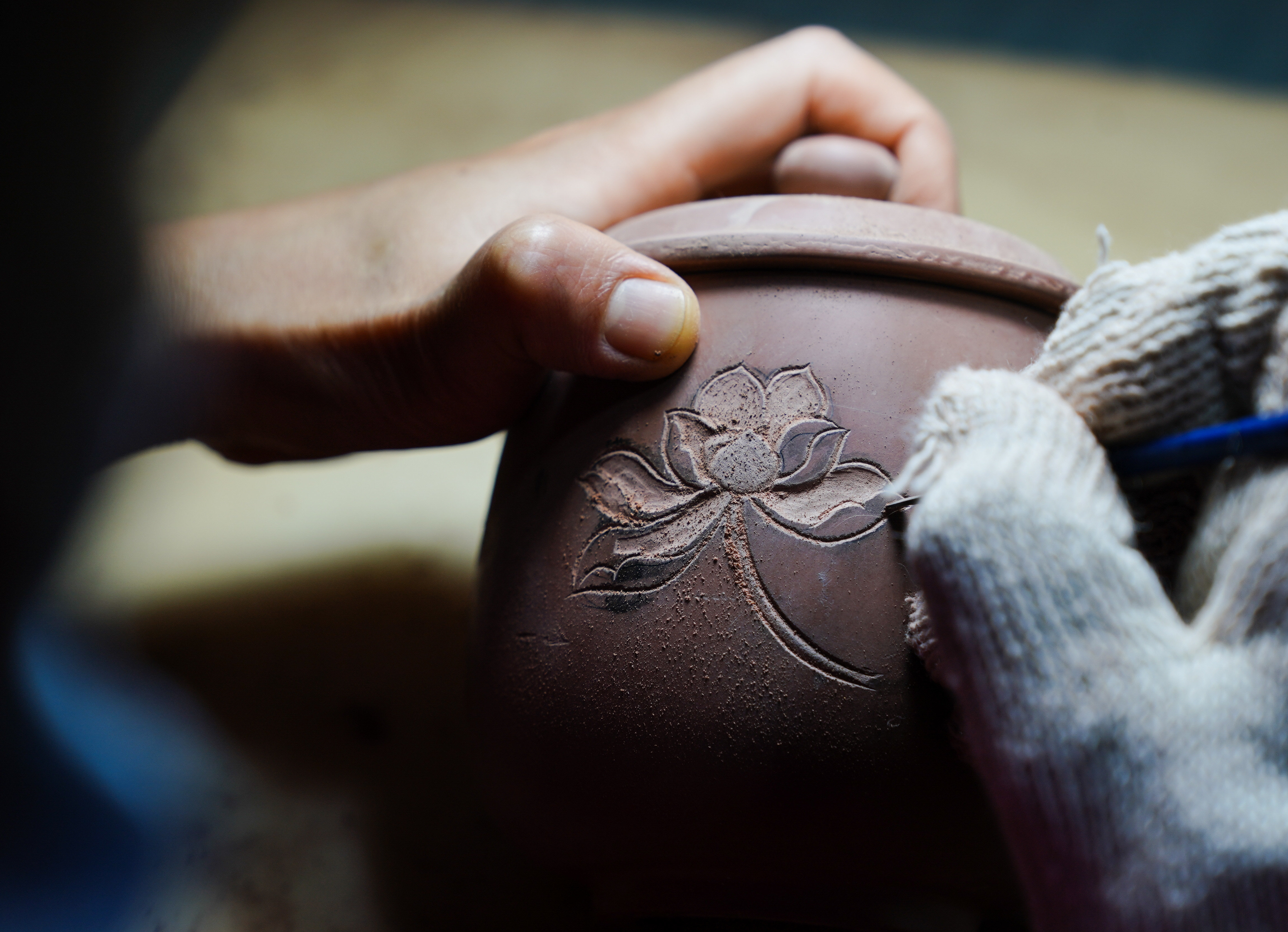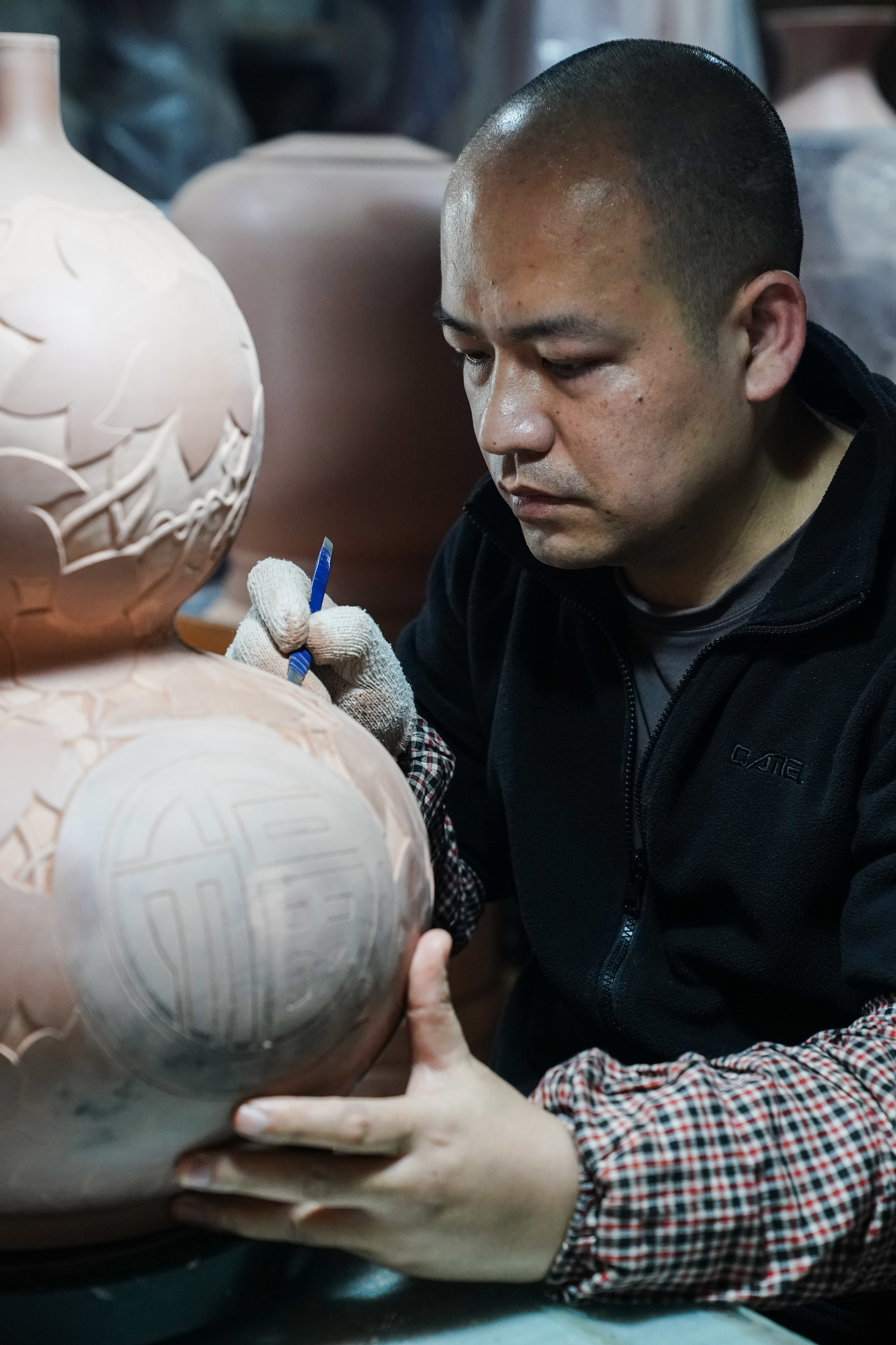 4月11日,在广西省钦州市,员工在坭兴陶生产车间进行雕刻工作。新华社记者 周佳谊 摄
