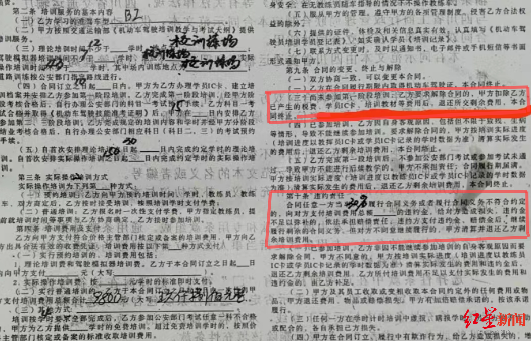 红星新闻记者在王女士提供的《四川省机动车驾驶员培训合同》上看到,双方约定的准驾车型为B2,费用为9800元。合同第九条“合同的变更、终止与解除”第三款注明“尚未参加第一阶段培训,乙方要求解除合同的,甲方扣除乙方已产生的税费、学院IC卡、培训教材等费用后,退还所交剩余费用,本合同终止”。也正是因为这一款,王女士认为“不应该支付30%违约金”。