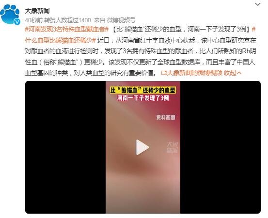 近日,从河南省红十字血液中心获悉,该中心血型研究室在对献血者的血液进行检测时,发现了3名拥有特殊血型的献血者,比人们所熟知的Rh阴性血(俗称“熊猫血”)更稀少。该发现不仅更新了全球血型数据库,而且丰富了中国人血型基因的种类,对人类血型的研究有重要价值。