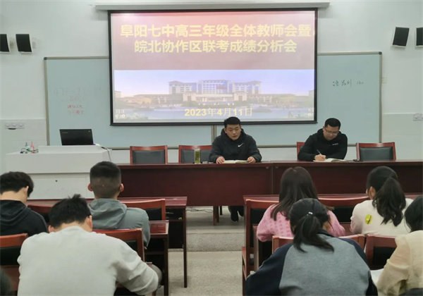 为在不足六十天的高考冲刺阶段提升教育教学质量,发挥联考的反馈指导功能,总结经验,完善管理,优化过程,4月11日下午,阜阳市第七高级中学2023届高三年级召开皖北协作区成绩分析会。阜阳七中副校长、高三年级部主任马磊,主任助理林涛及全体高三教师参加本次会议。