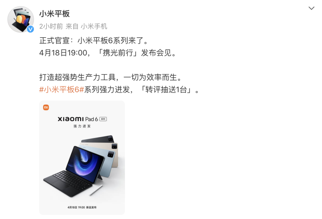 小米 Pad 6 系列官宣:4 月 18 日 19:00 与小米 13 Ultra 一同发布。