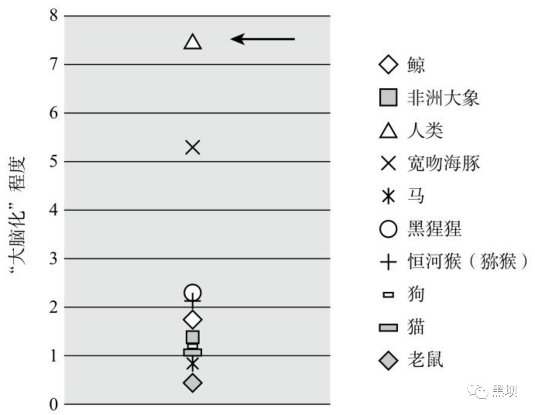 人类大脑的“大”,是说人类大脑偏离预期(通常指偏离身体大小)的程度,远远超出其他动物——比同类(非人类灵长类动物)高出差不多2倍,比偏离程度仅次于人类的宽吻海豚,也要高出50%。这意味着,人类的大脑在承担基础的身体管理、维护、监控功能之外,还有闲置的资源做更多的事情。