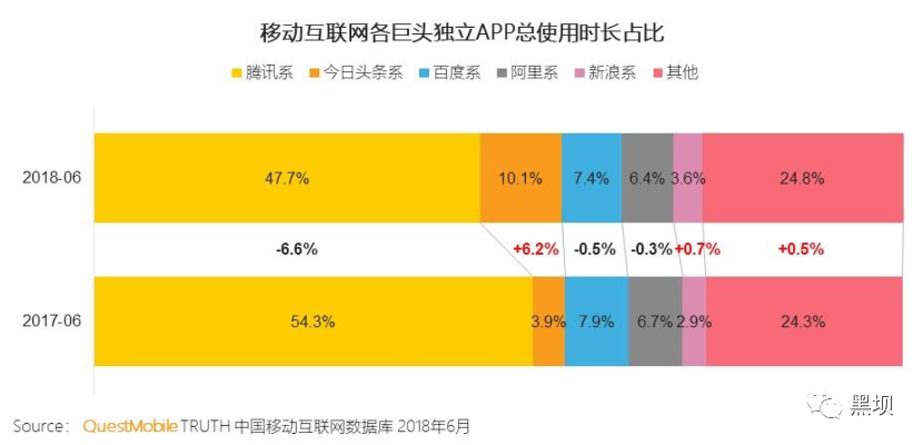 微视的第二次失败无需着墨太多。2017年抖音强势崛起,沉浸在王者荣耀单个皮肤一天卖到1.5亿人民币的腾讯并未太过留意。等到后院起火——腾讯系App用户使用时长大跌(减少部分接近于头条系App的增长),腾讯才后知后觉,着手对抖音的狙击。