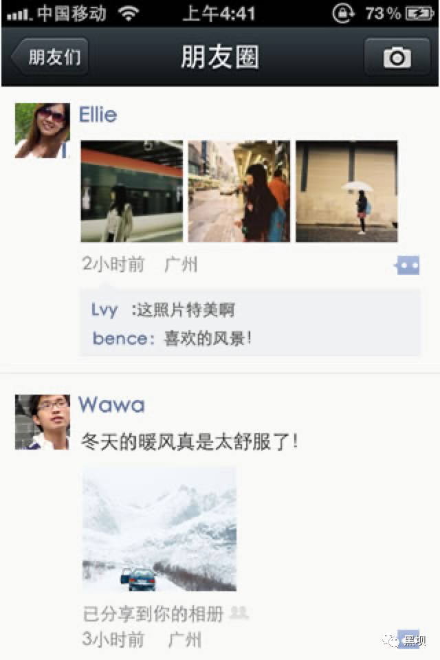 再看朋友圈。朋友圈很容易被人忽略的一点是,它其实是个图片分享功能。微信团队对朋友圈的定位是一个“只能发照片,不能发纯文字”的“广场”,如果我们稍加留意,就会注意到朋友圈的内容发布入口,一直是用一个照相机icon指代,单击默认发图片(文字其实也可以发,只是入口更为隐蔽)。