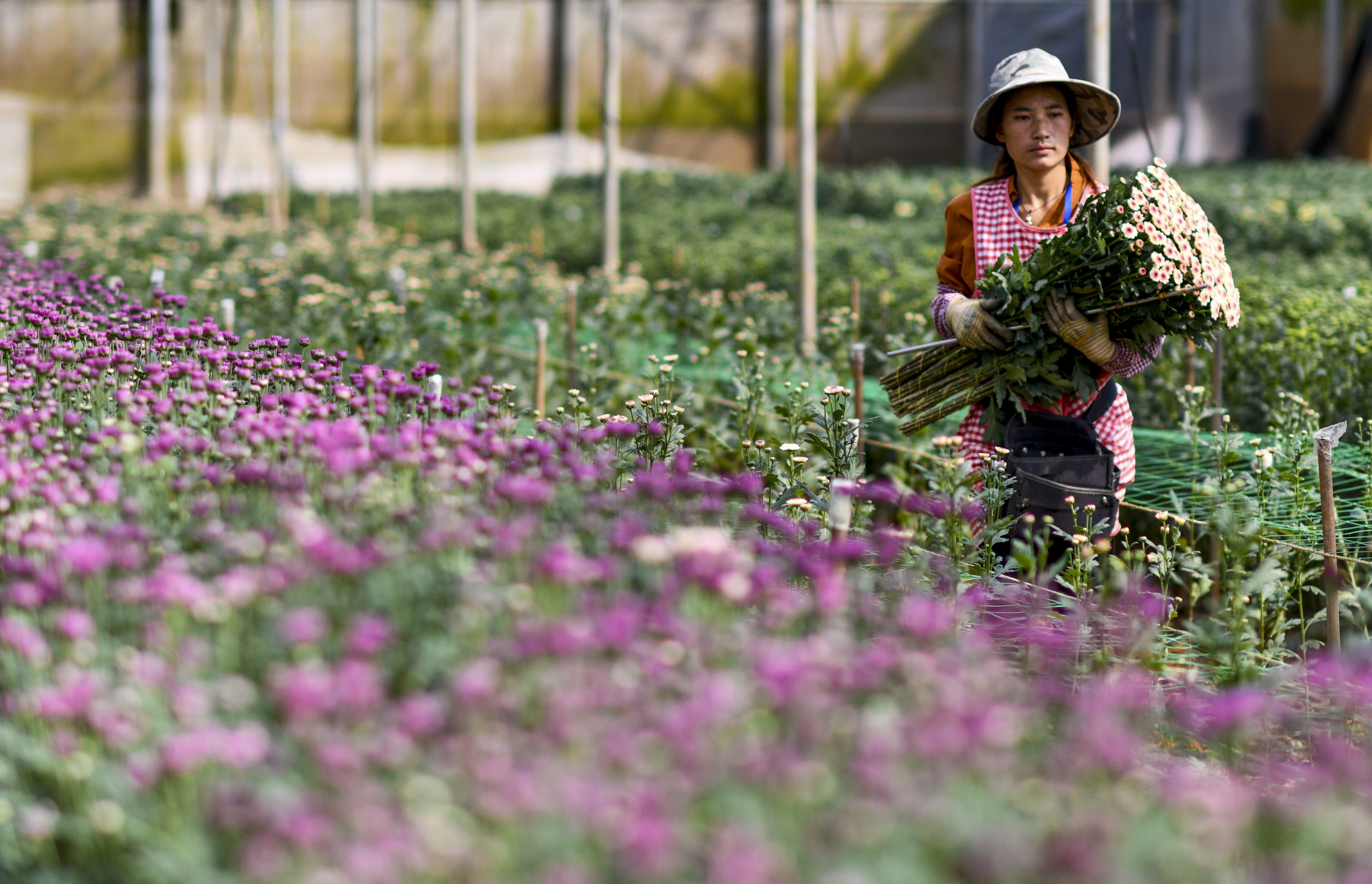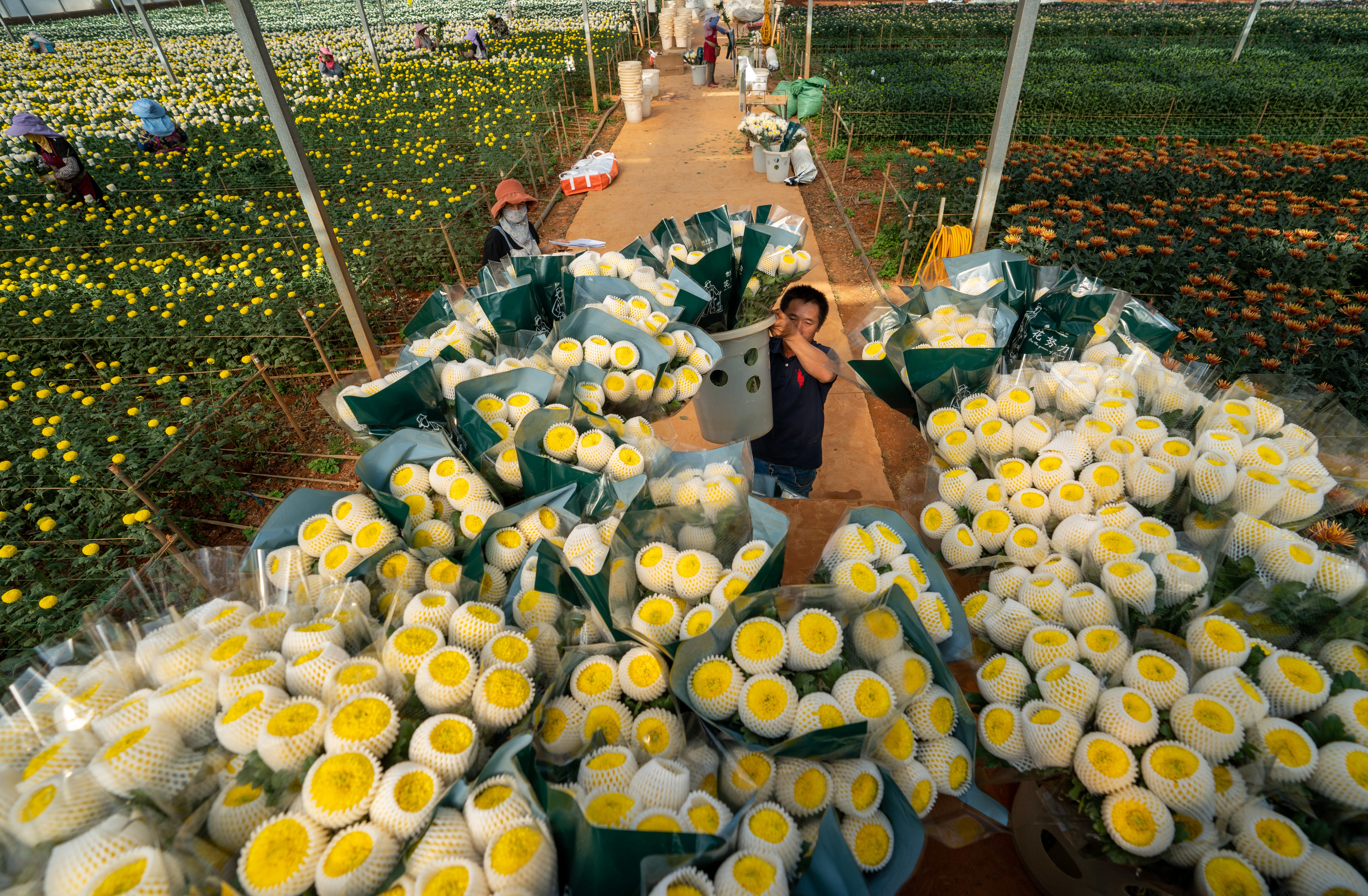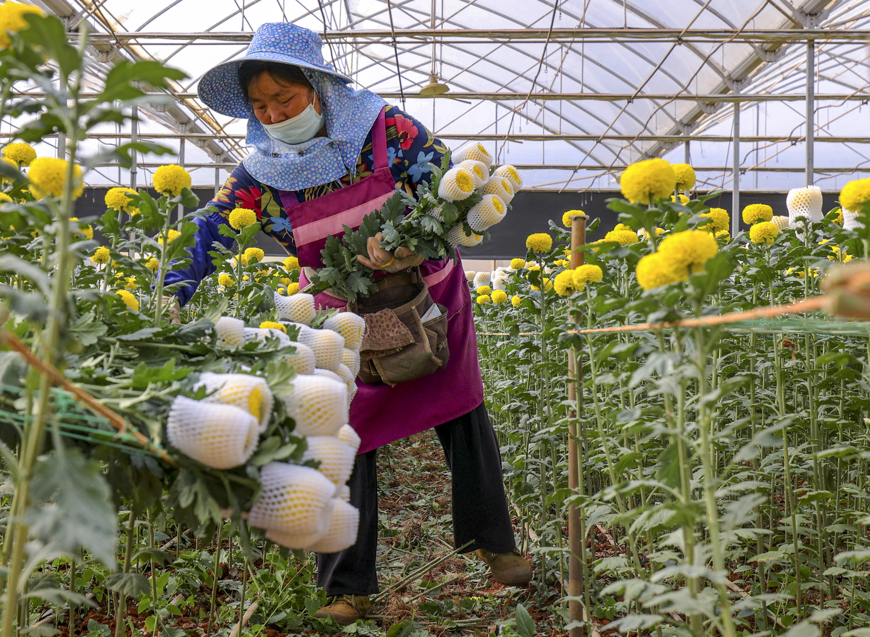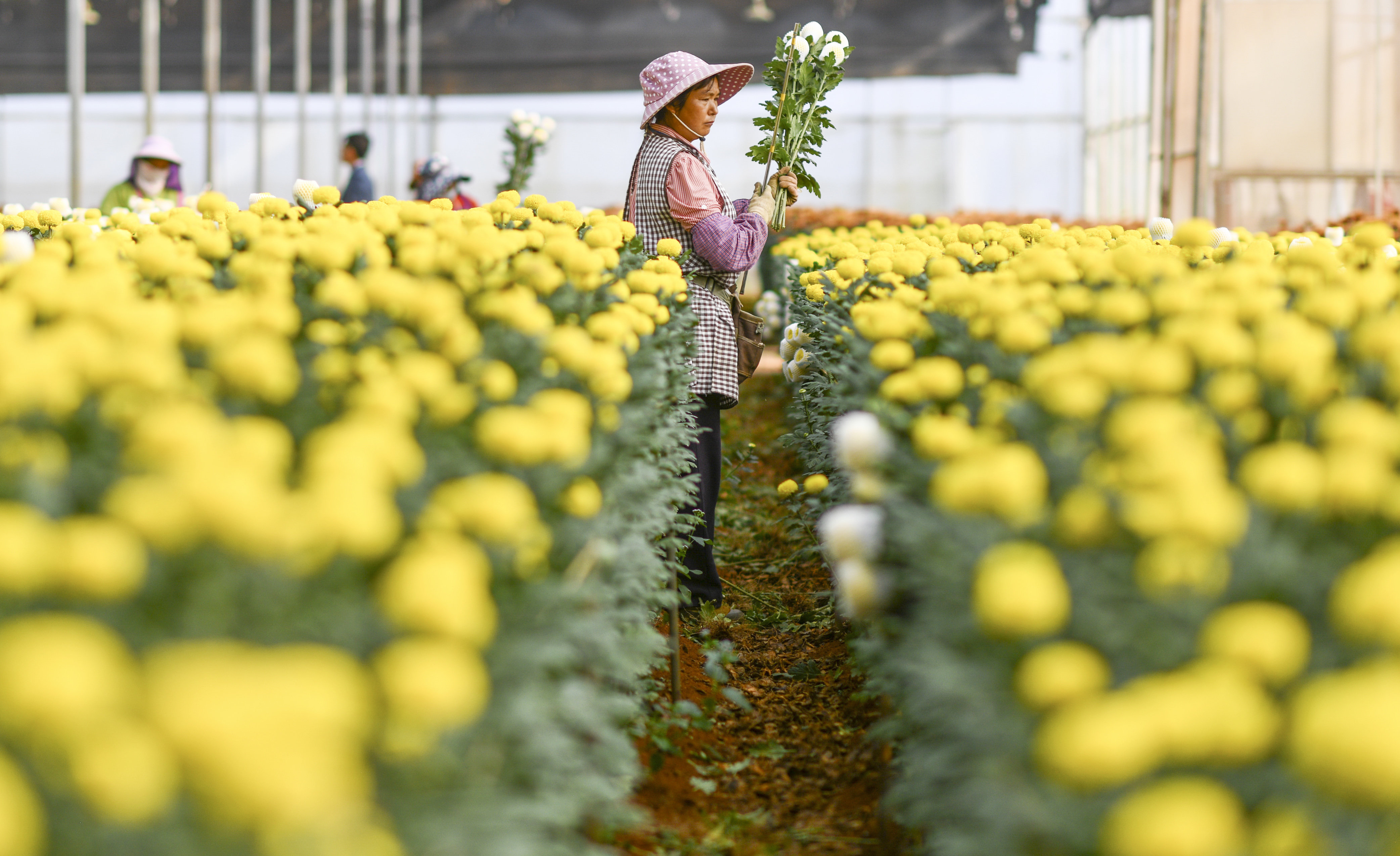 云南省开远市的花农采摘鲜花(3月22日摄)。新华社记者 崔文 摄